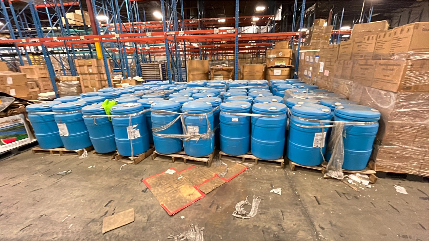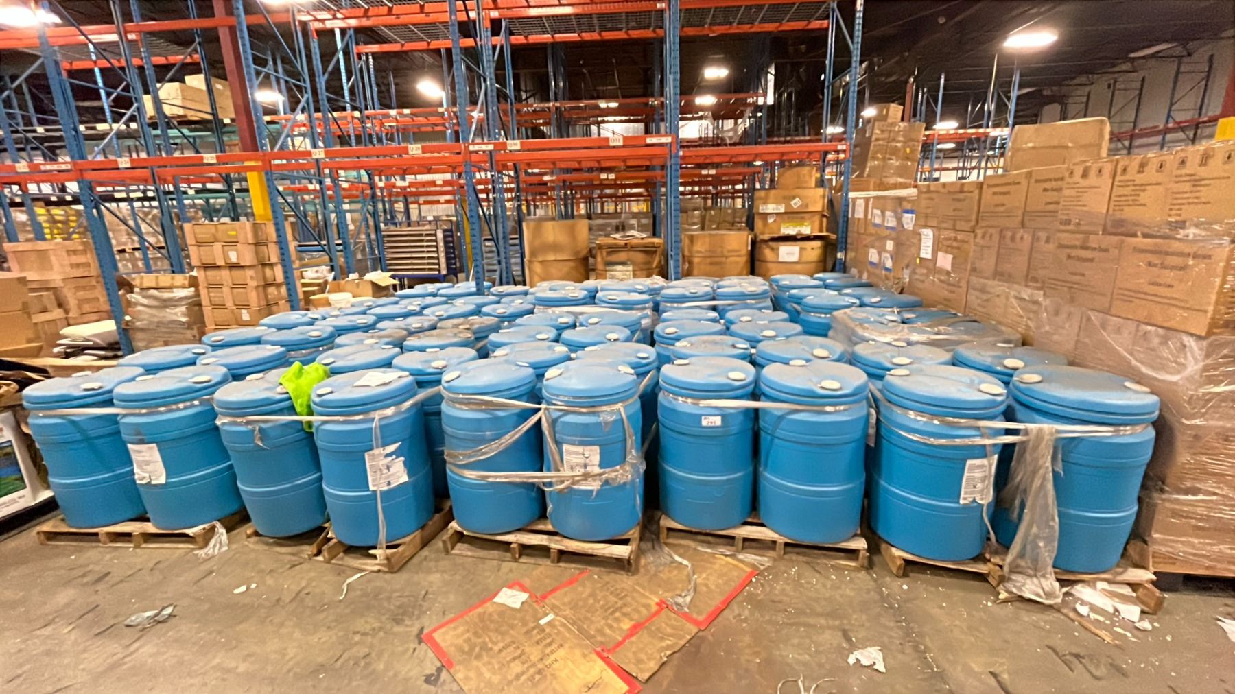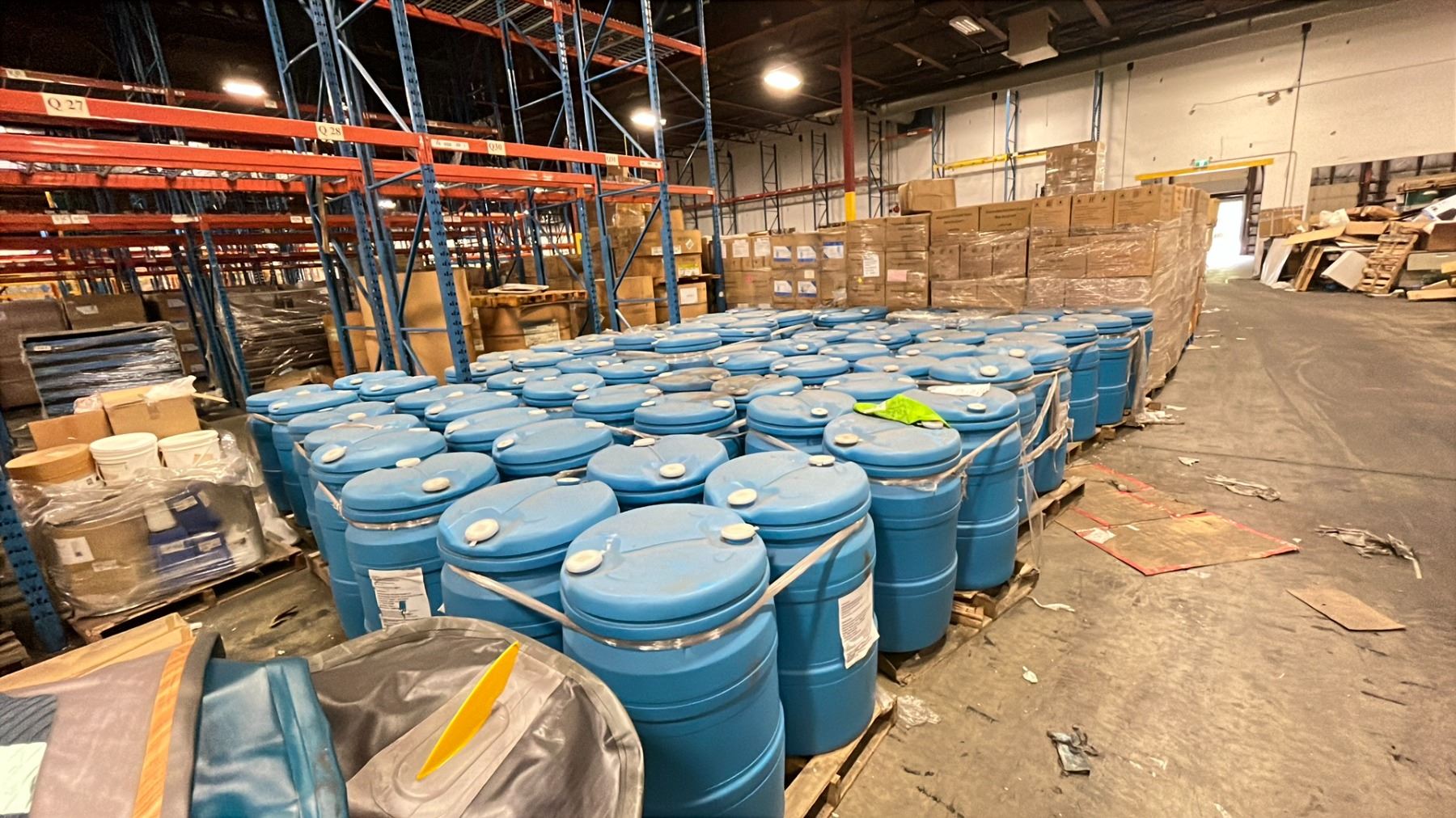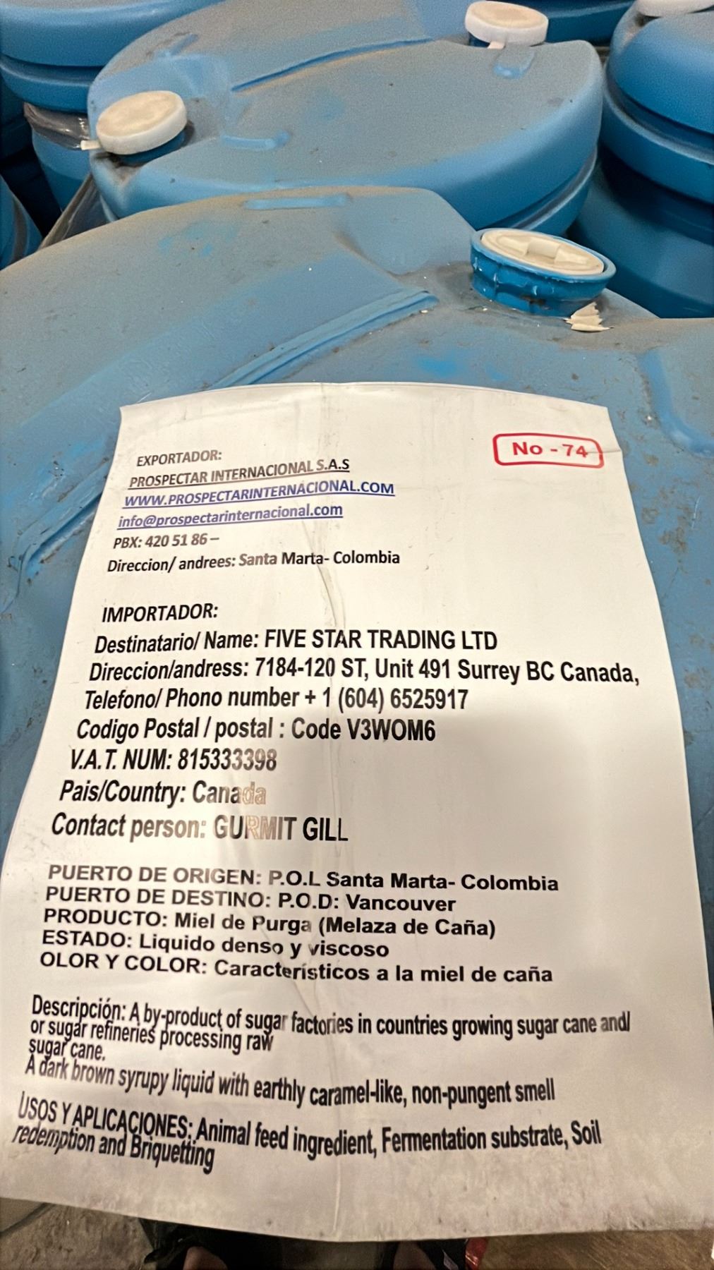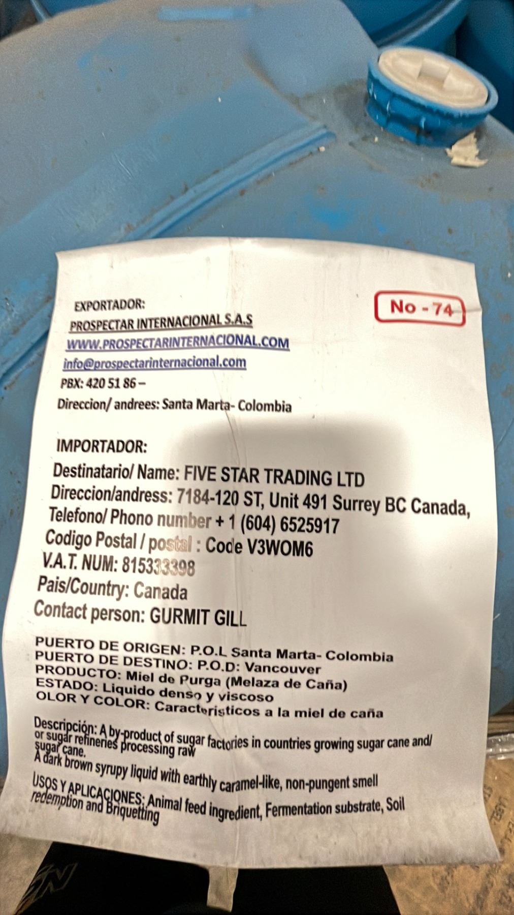 79 PLASTANK BLUE LIDDED BARRELS WITH UNKNOWN CONTENTS **POSSIBLY SYRUPY LIQUID BY-PRODUCT OF SUGAR REFINERY**