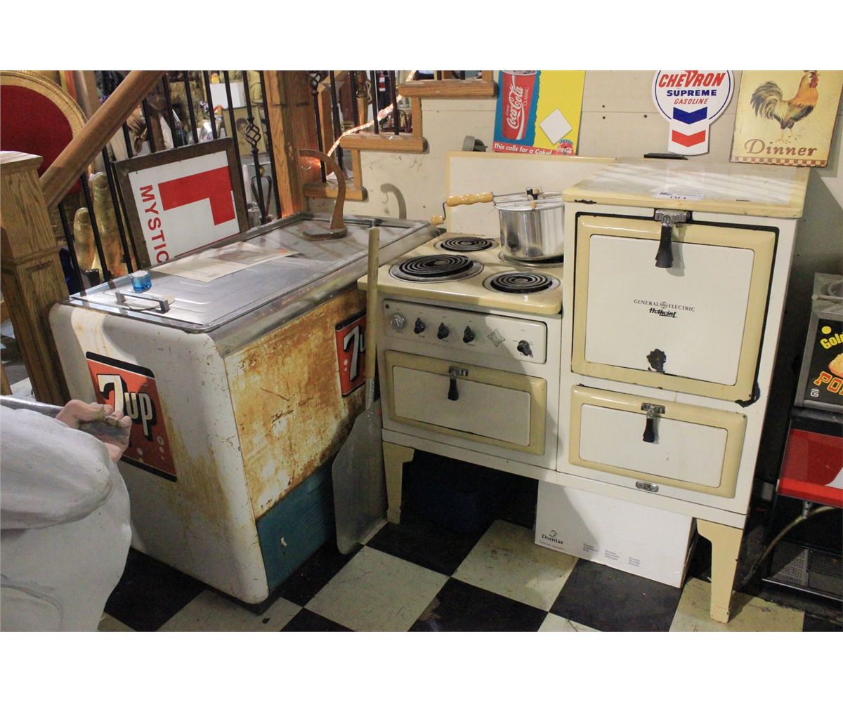 7UP CHEST COOLER, GE ANTIQUE HOTPOINT STOVE, & ASSORTED KITCHEN WARES