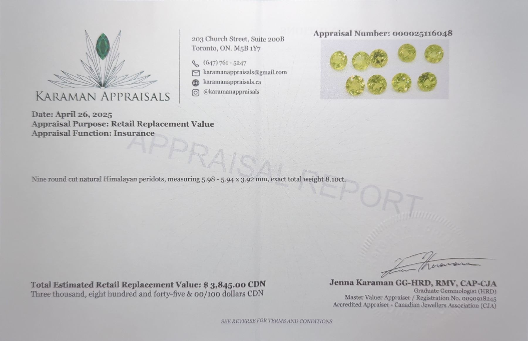 8.1 CT CERTIFIED PERIDOT GEMSTONE PARCEL ($3,845 APPRAISAL, APPRAISAL NOT GUARANTEED)