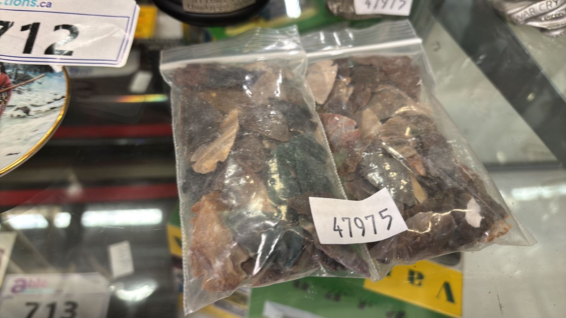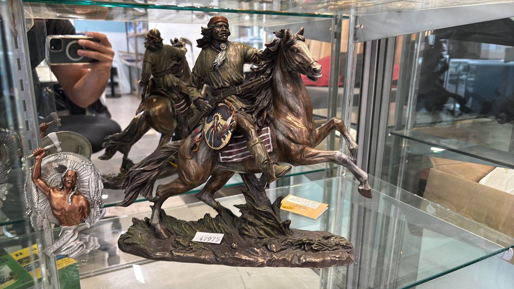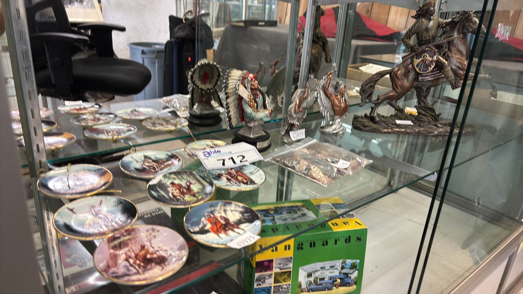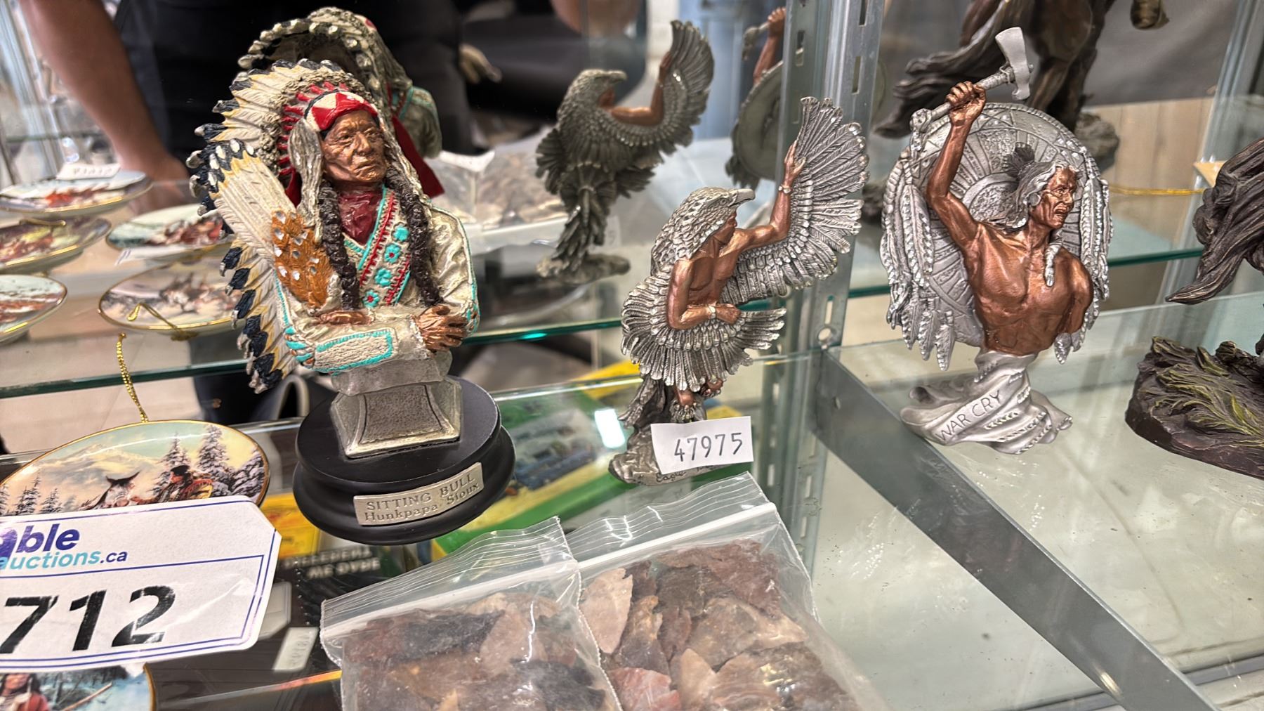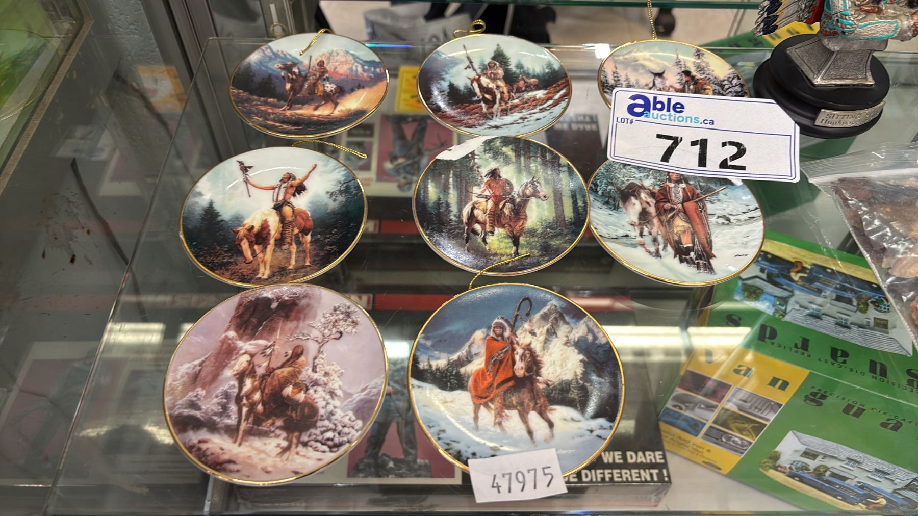 (8) ASSORTED 3.5" DIA. COLLECTOR PLATES, FLINT ARROWHEADS, GERONIMO ON HORSEBACK STATUE & MORE