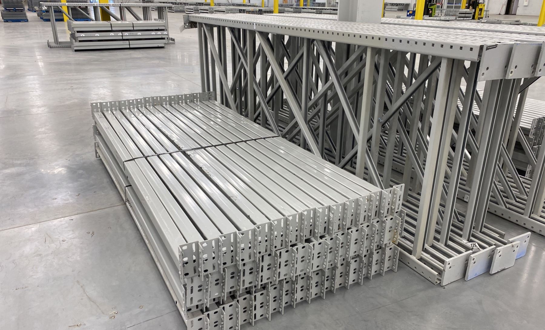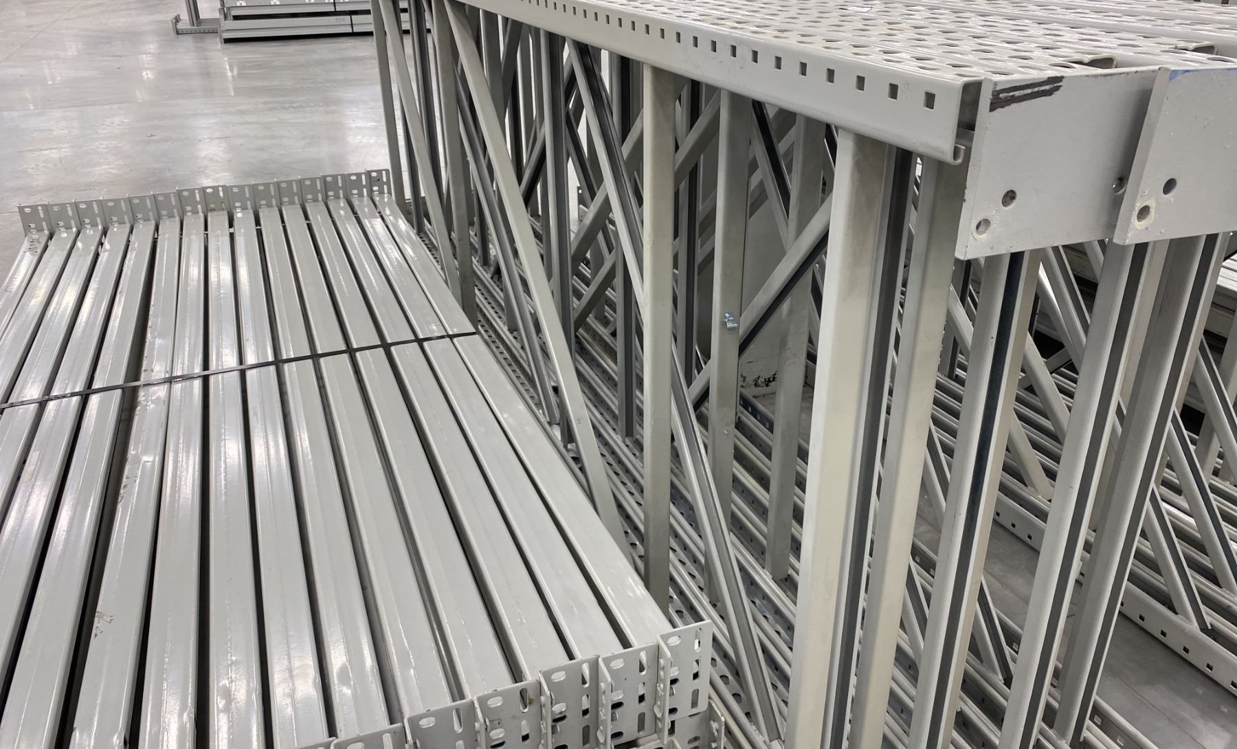 8 BAYS GREY INDUSTRIAL PALLET RACKING (9) UPRIGHTS 144" X 48" AND (60) SIDE BEAMS 102" X 2.5" WITH 8" X 6" WELDED FOOTPLATES 1/2" THICK