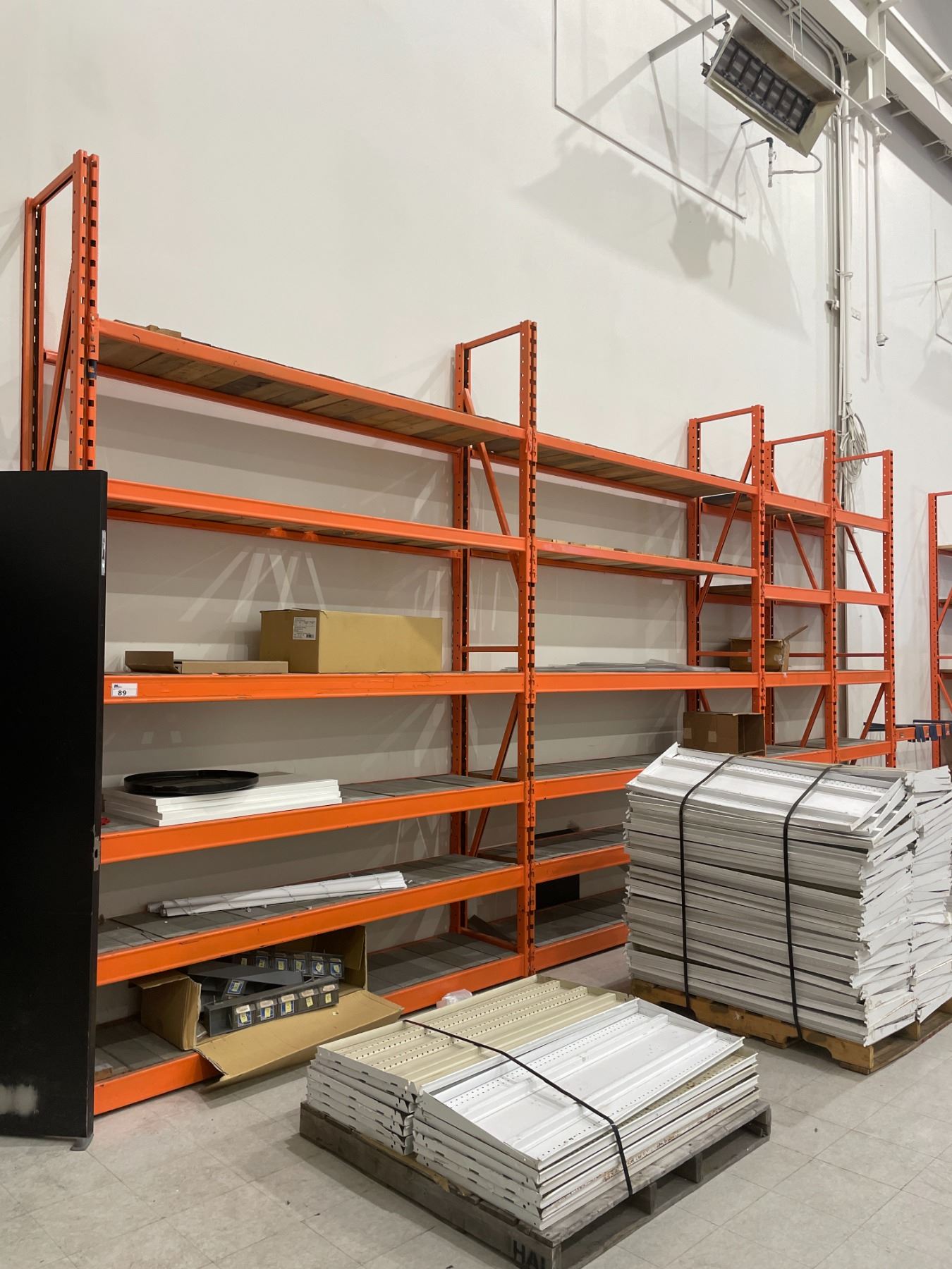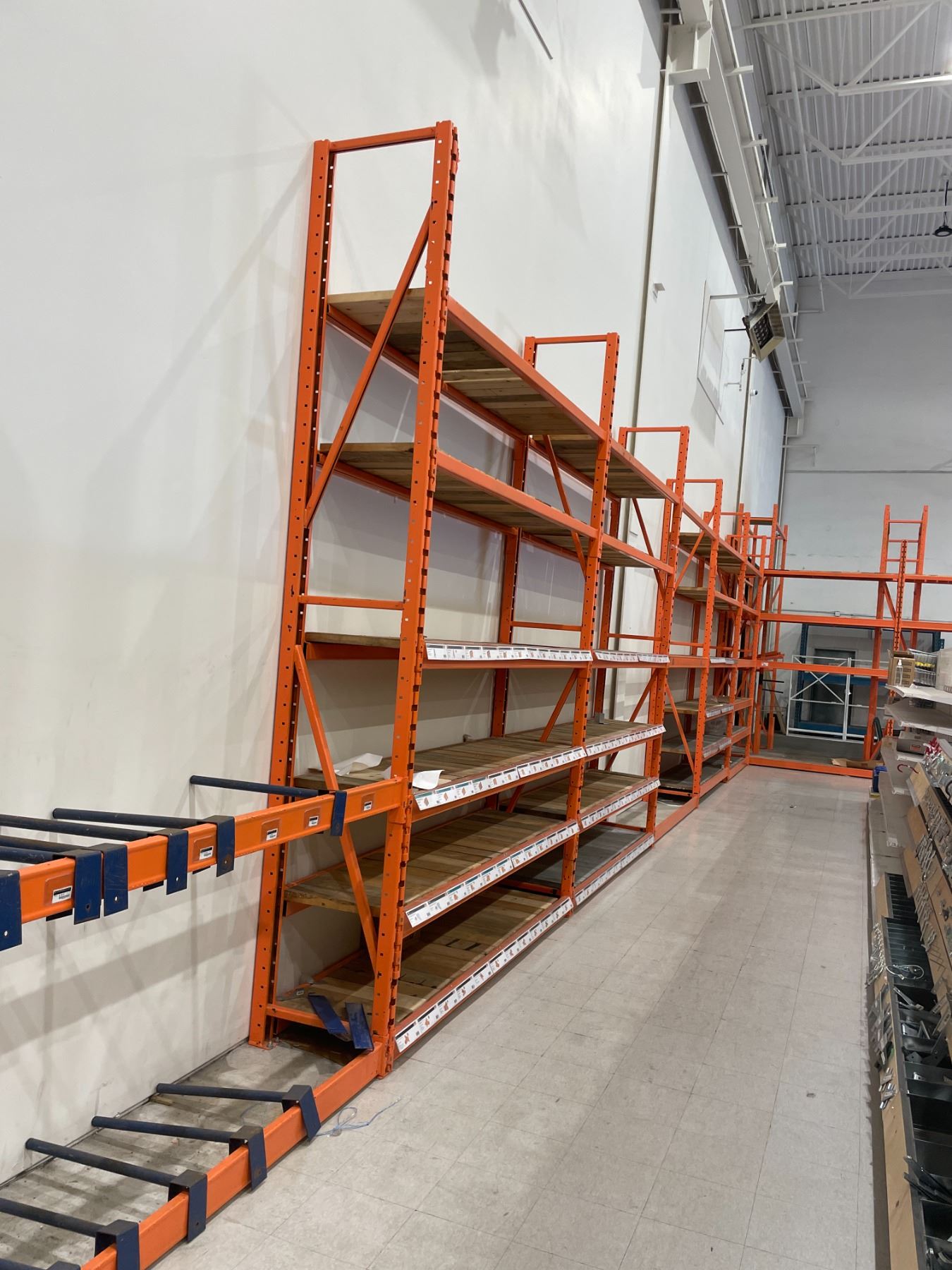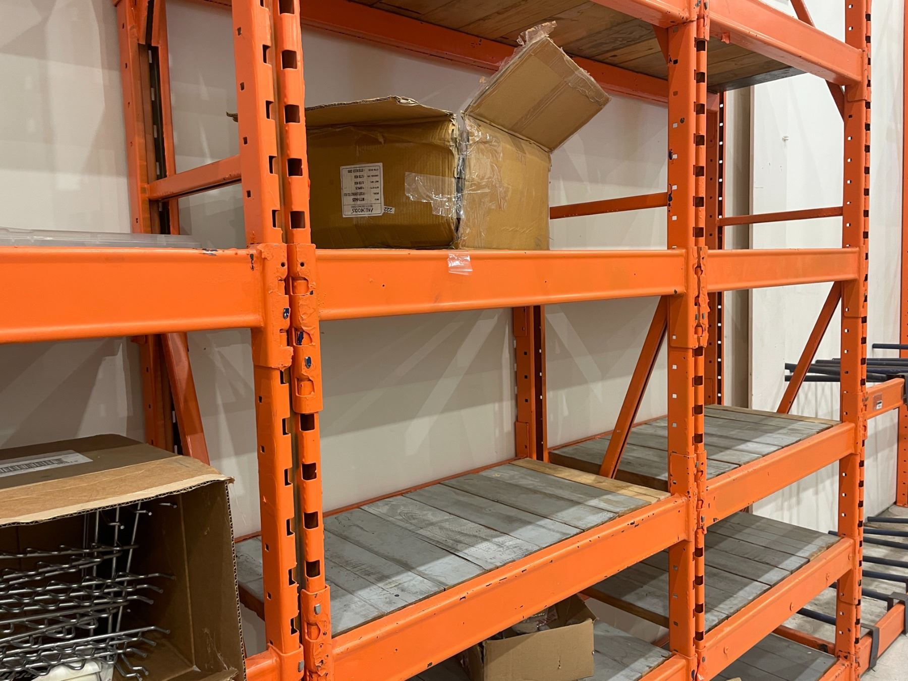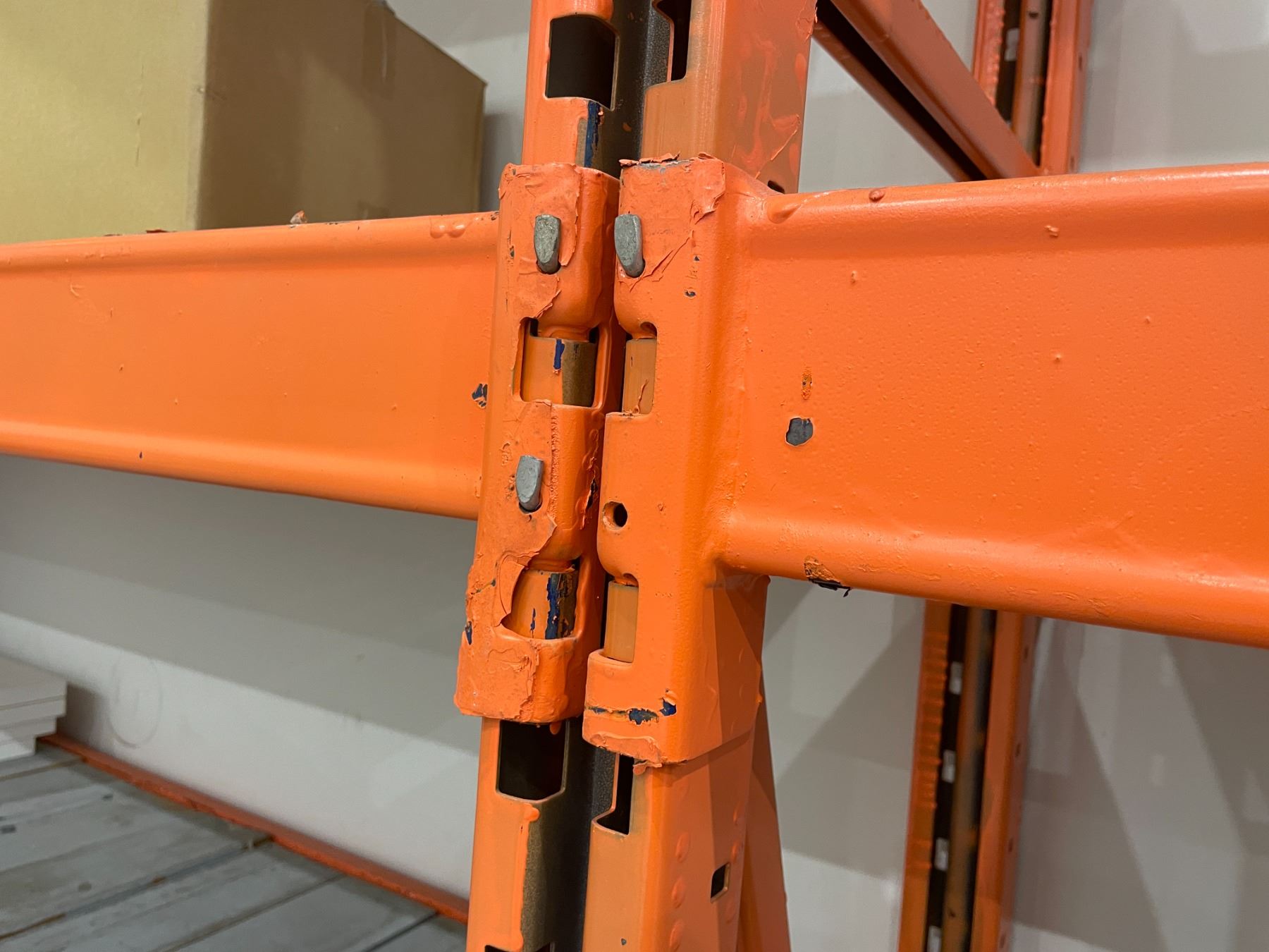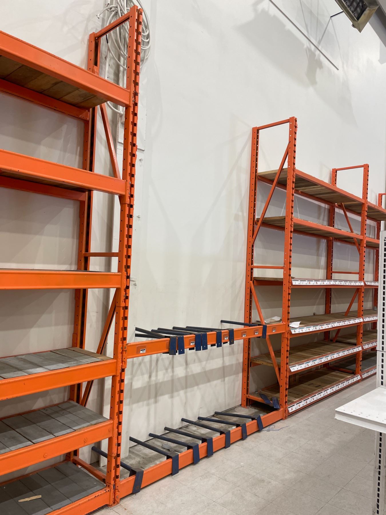 8 BAYS OF ORANGE 12' TALL 24" DEPTH 8' WIDE CROSSBAR ADJUSTABLE INDUSTRIAL PARTS RACKING & 2 BAYS OF 12' TALL 24" DEPTH 42" WIDE CROSSBARS
