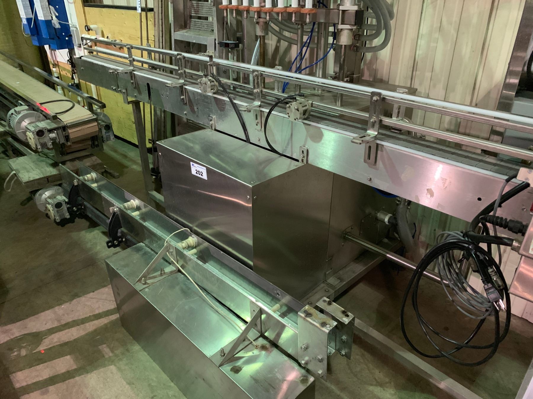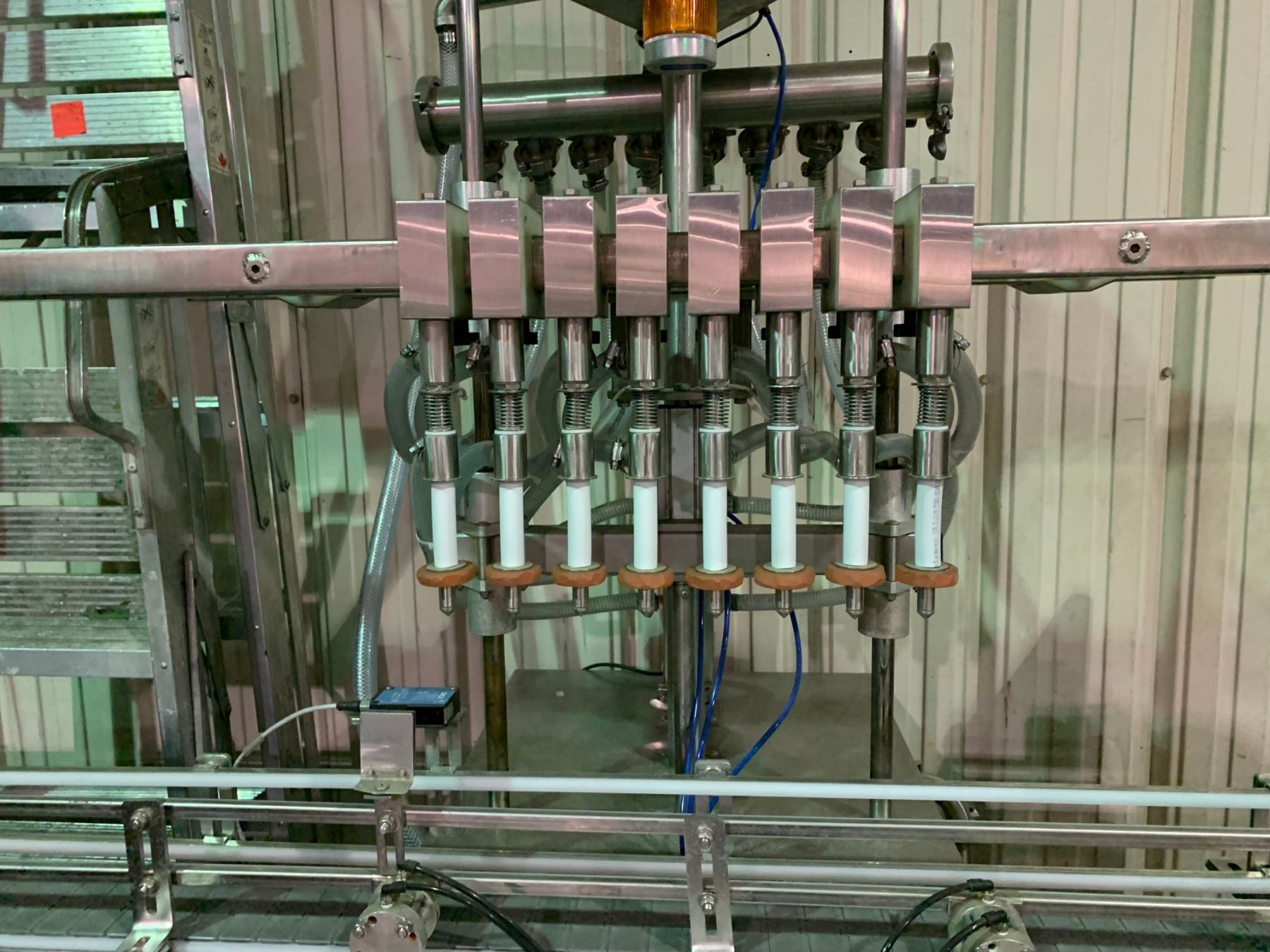 8 BOTTLE STAINLESS STEEL LINE FILLER WITH CONVEYOR SECTION & MOTOR CONTROLS