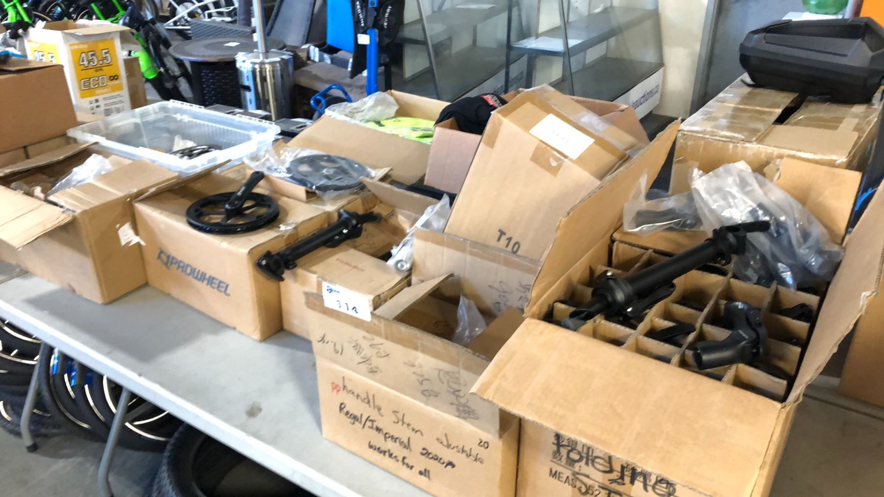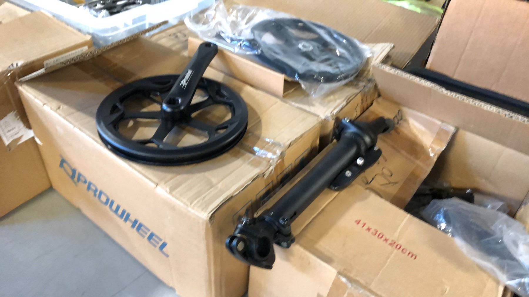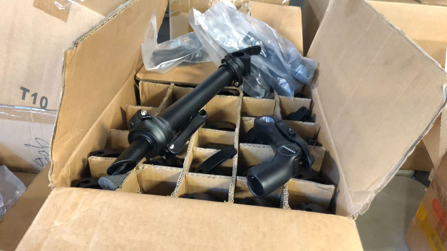 8 BOXES OF BICYCLE PARTS INCL FOLDING STEM, CRANK SET AND MORE
