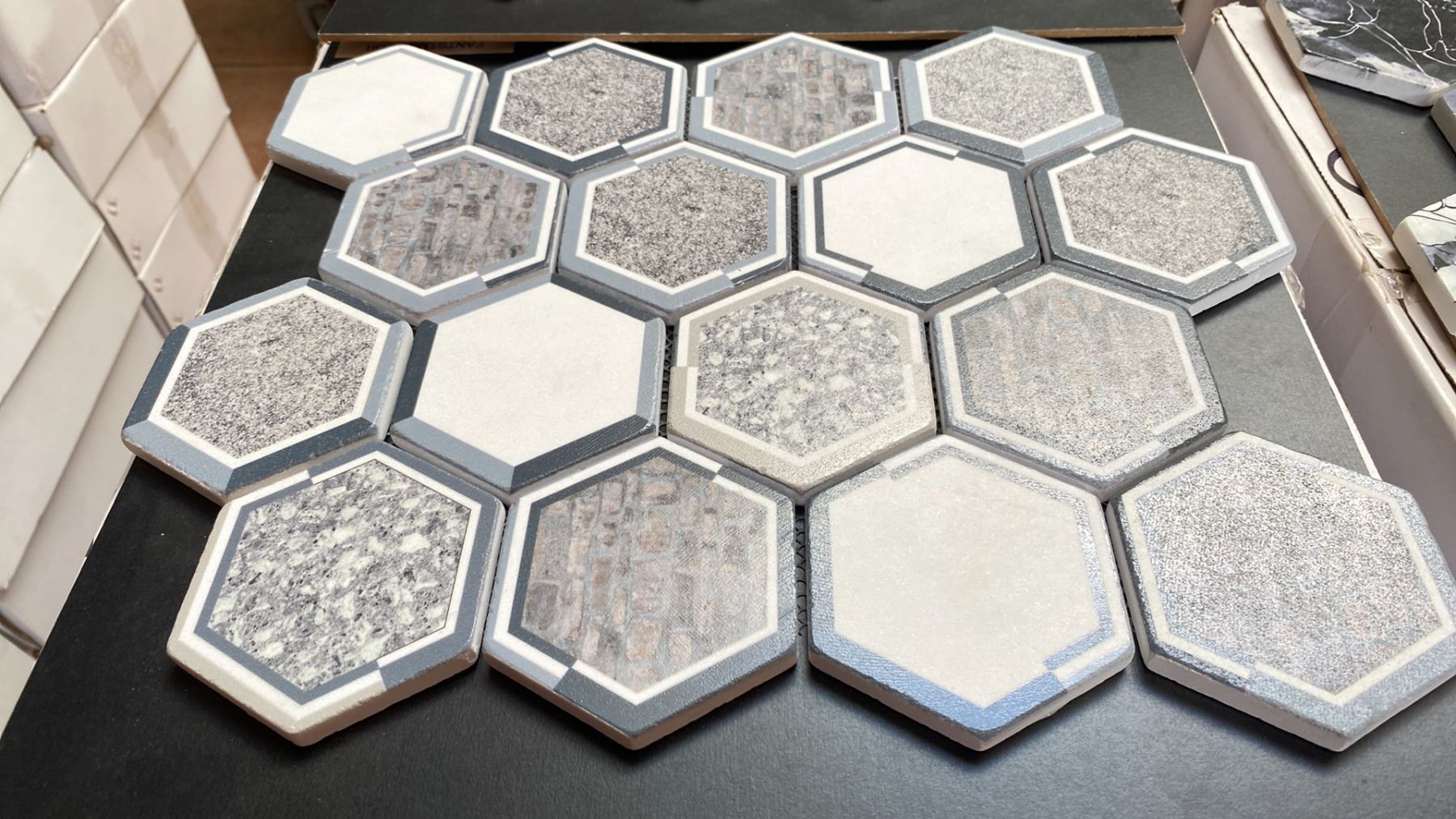 8 BOXES OF MARBLE MOSAIC HEXAGON TILE IN FANTSTMORDOR 11 X 1SQ.FT. SHEETS PER BOX APPROX 88SQ.FT. TOTAL