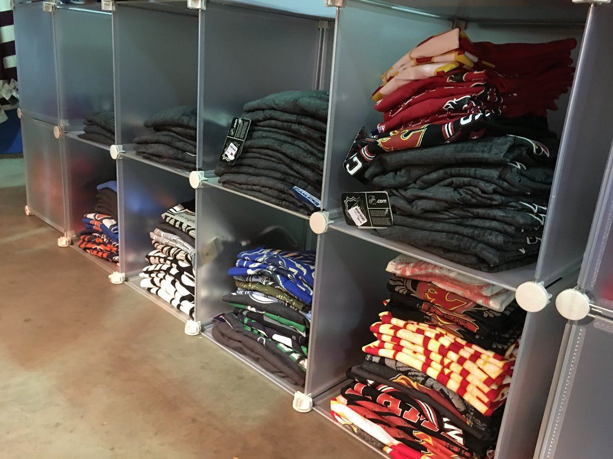 8 CUBBY STORAGE UNIT FILLED WITH ASSORTED NHL LOGO SHIRTS - KINGS, CANUCKS, OILERS ETC SHELF UNIT INCLUDED