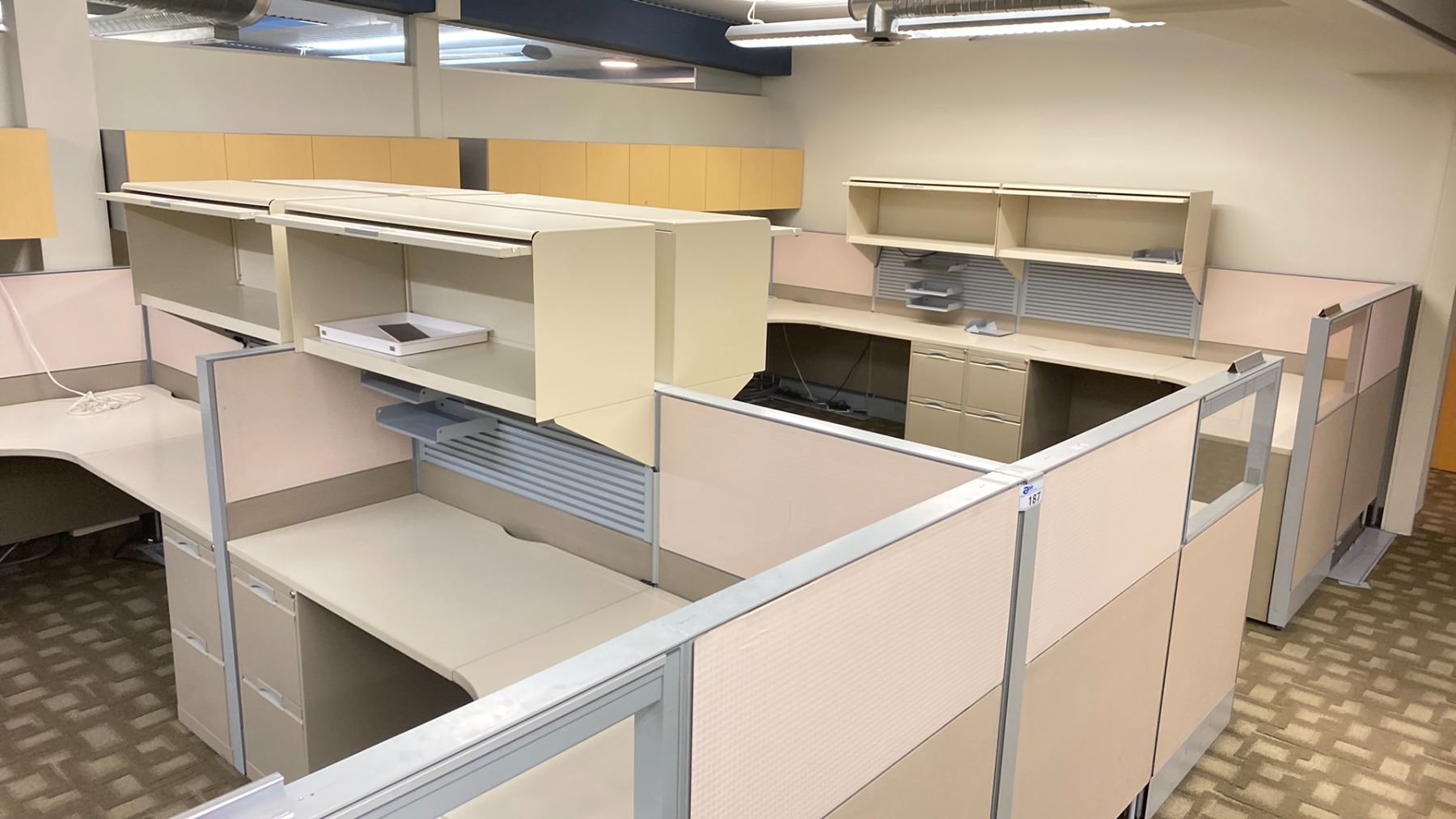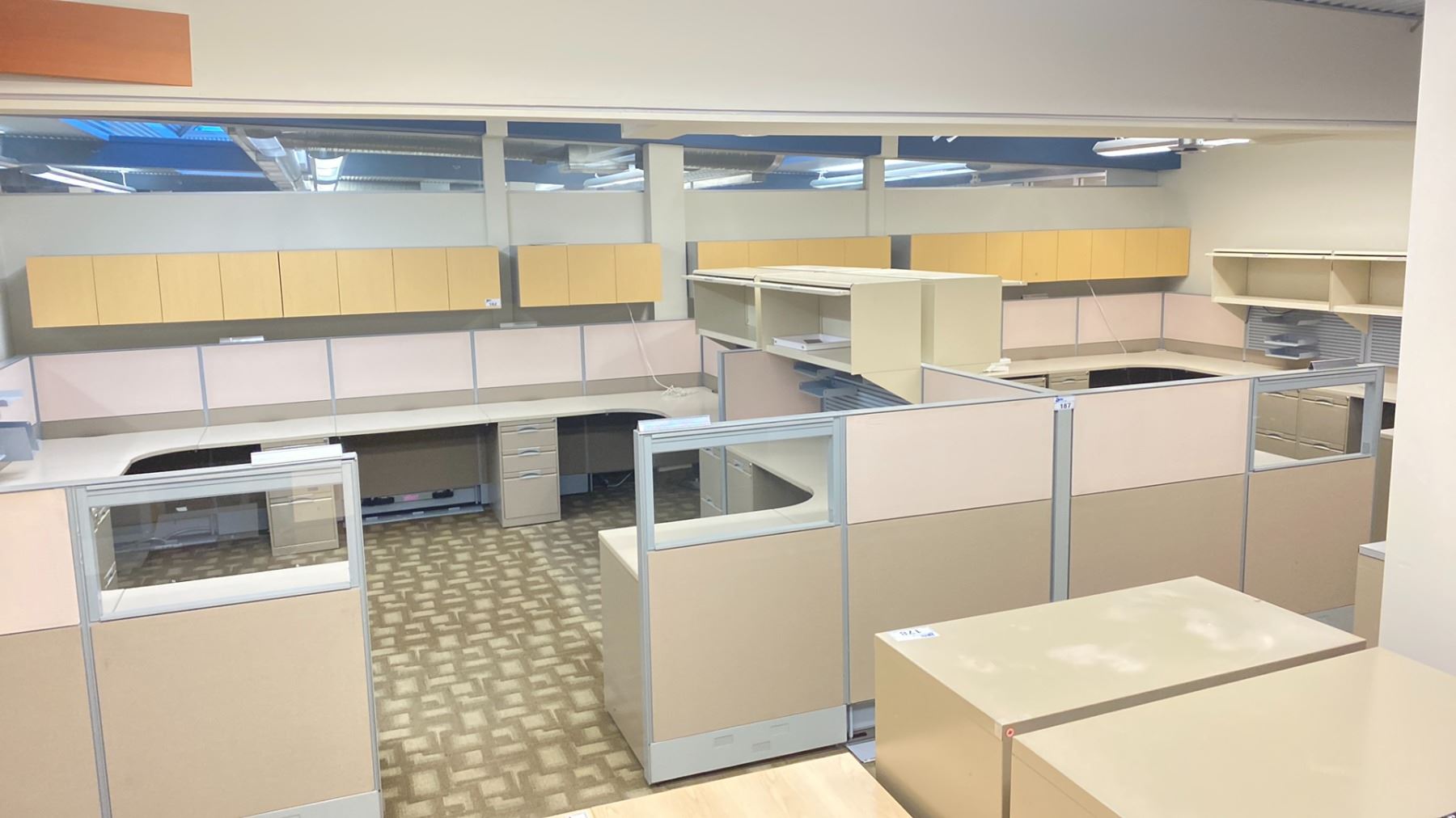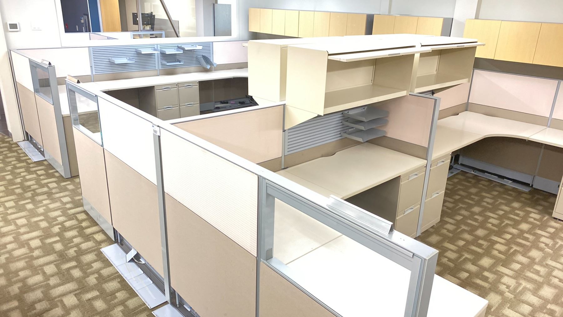 8 DESKS WITH CUBICLE WALLS OFFICE WORK STATION SYSTEM *APPROX. DIMENSIONS 26FT ACROSS X 14FT WIDE X 4FT HIGH*