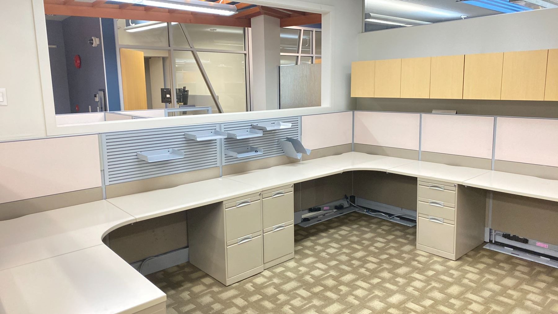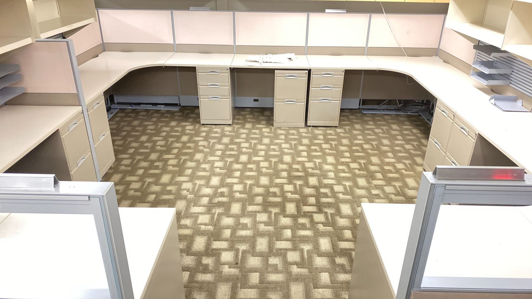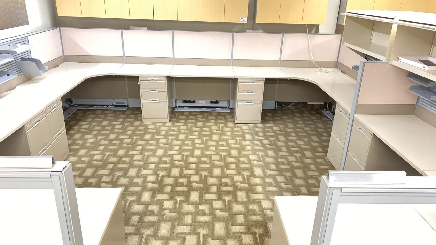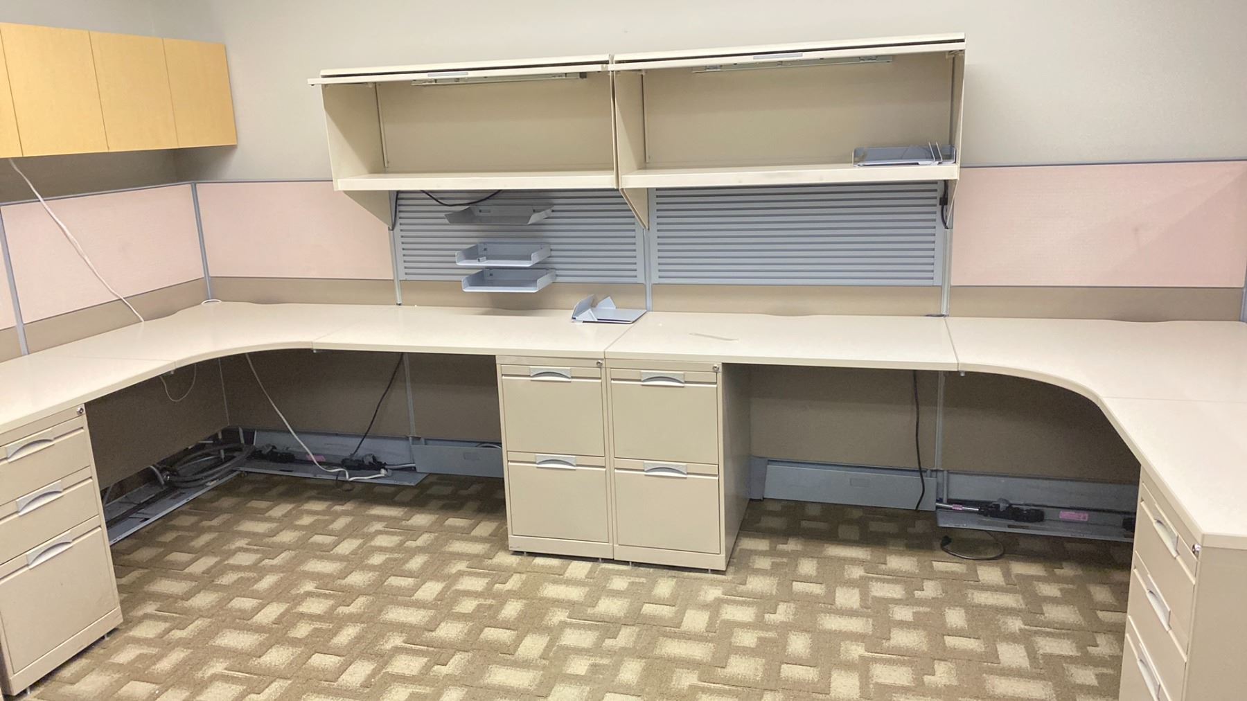 8 DESKS WITH CUBICLE WALLS OFFICE WORK STATION SYSTEM *APPROX. DIMENSIONS 26FT ACROSS X 14FT WIDE X 4FT HIGH*