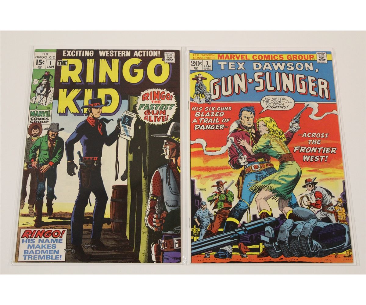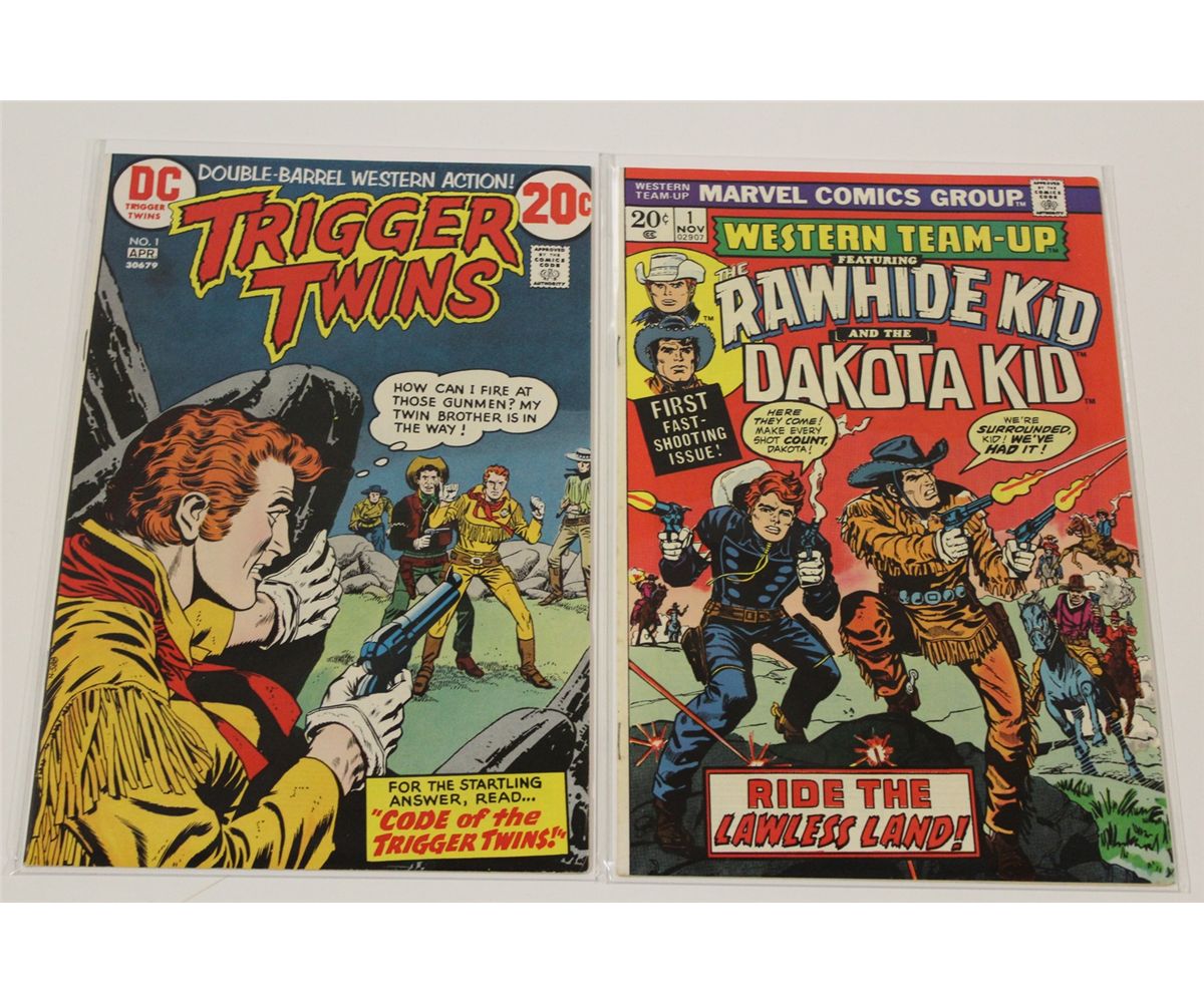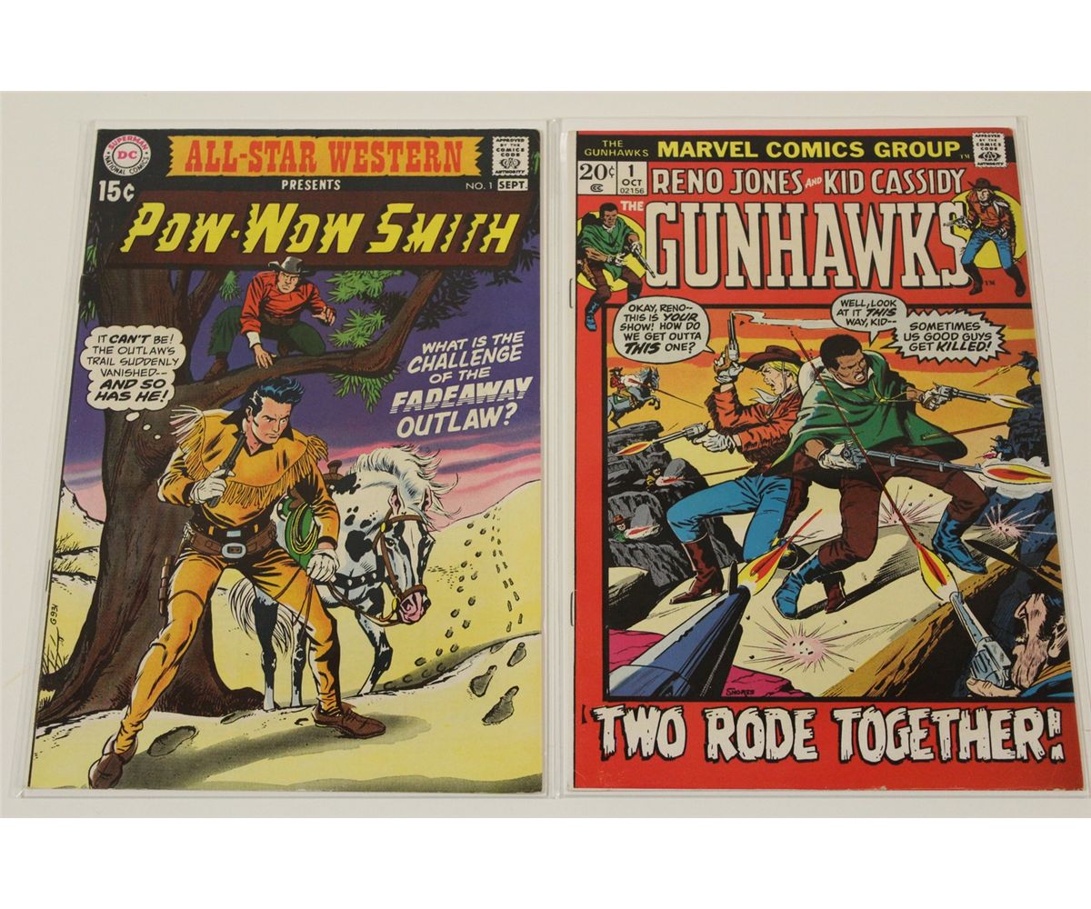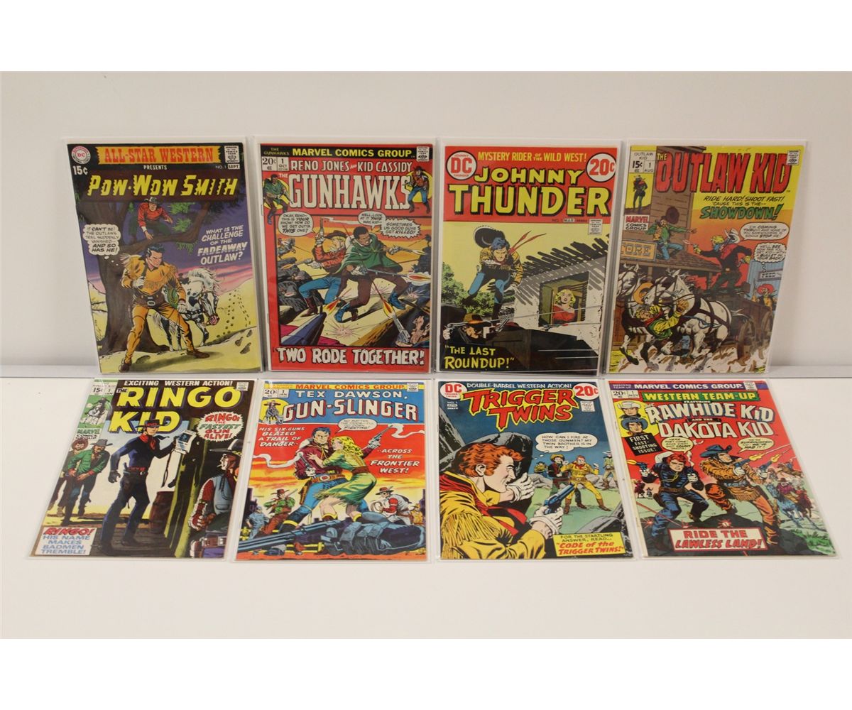 8 HIGH GRADE DC & MARVEL WESTERN #1'S (1970-73) ALL 1ST ISSUE 15-20 CENT BROZE COPIES. INCLUDES ALL- STAR WESTERN #1, GUNHAWKS #1, JOHNNY THUNDER #1, OUTLAW KID #1, RINGO KID #1, TEX DAWSON, GUN-SLINGER #1, TRIGGER TWIN #1 & WESTERN TEAM-UP #1. ALL 8 ARE HIGHER GRADE, SHARP, WHITE, GLOSSY, TIGHT & SUPPLE, 8 GEMS! OVERSTREET TOP END GUIDE VALUE OF OVER $300