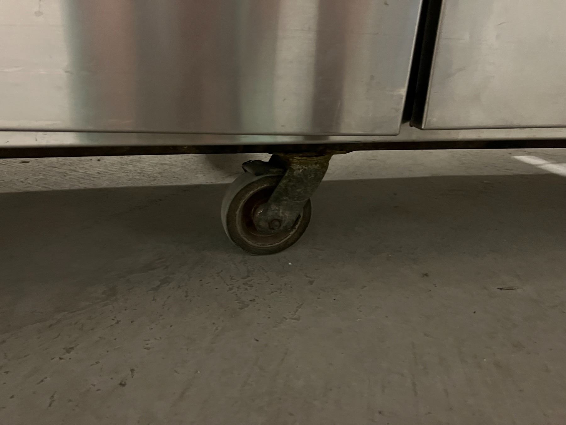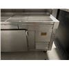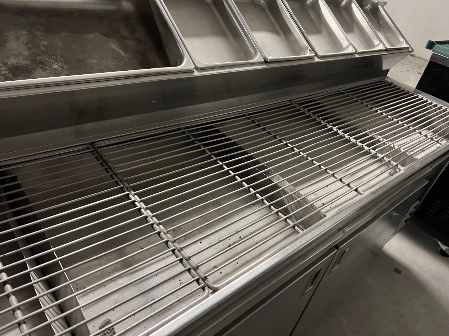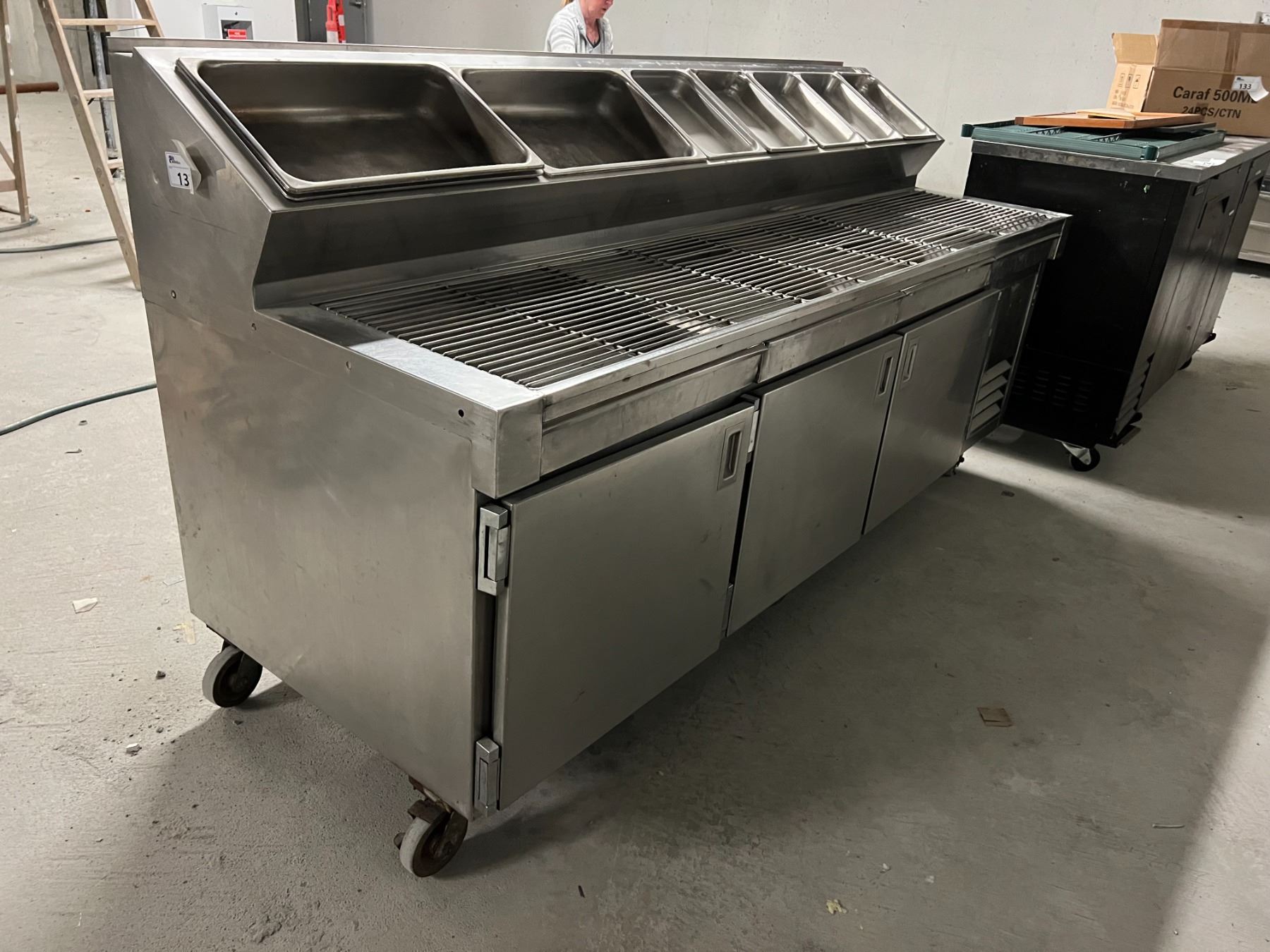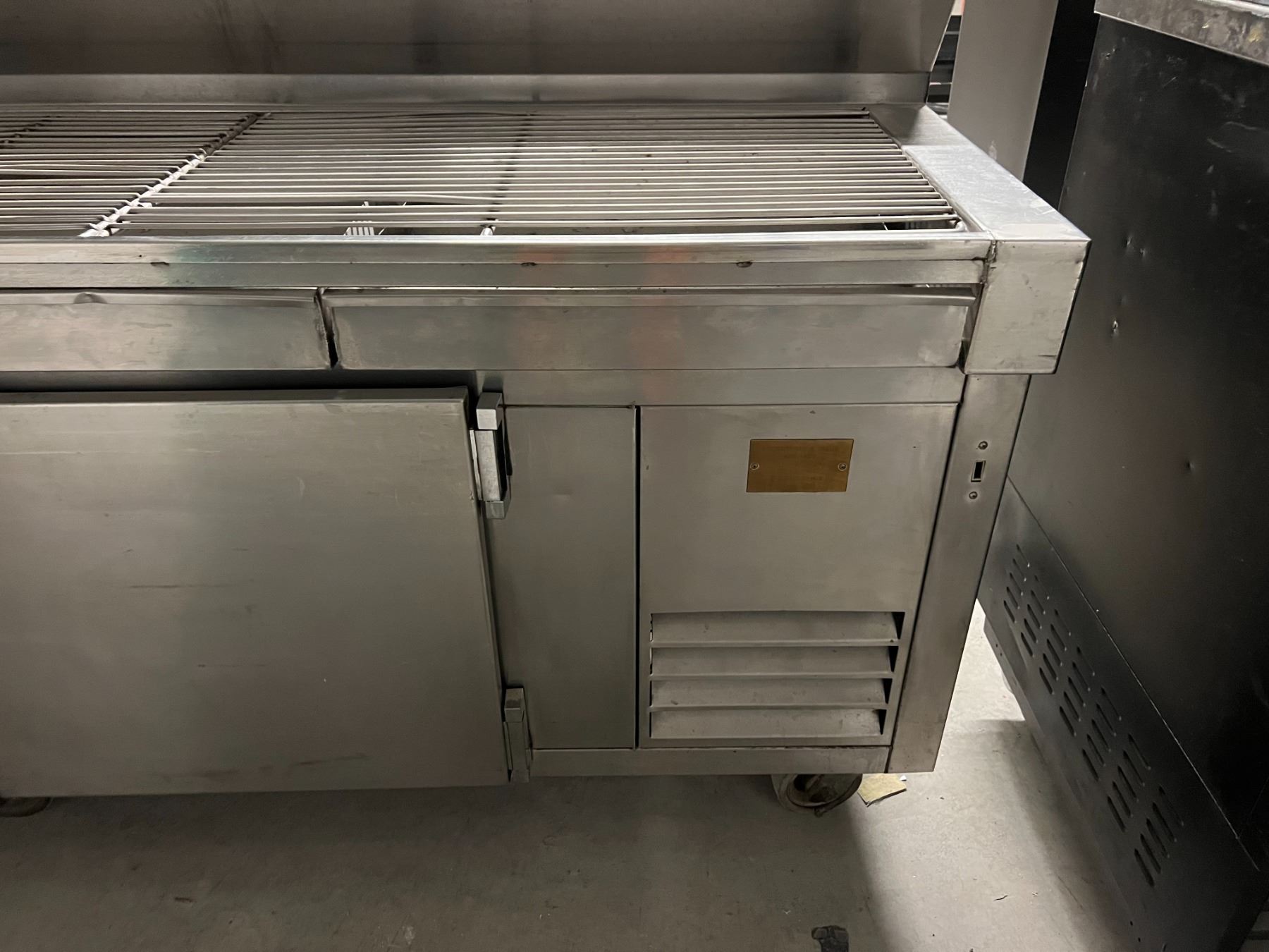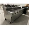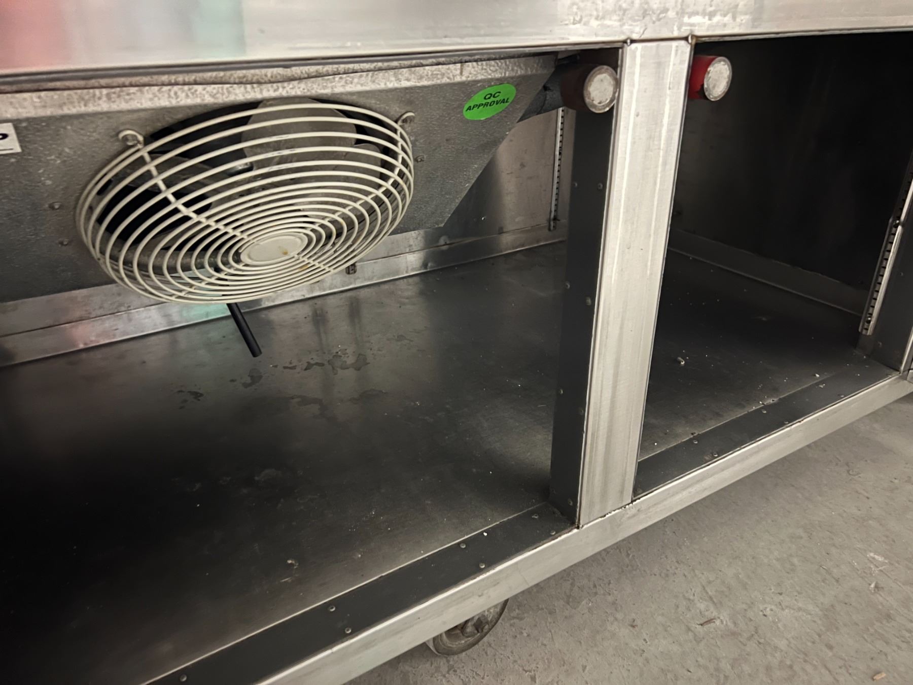 8' LONG STAINLESS CHILLER PREP TABLE ON WHEELS. TOP IS ALSO CHILLED