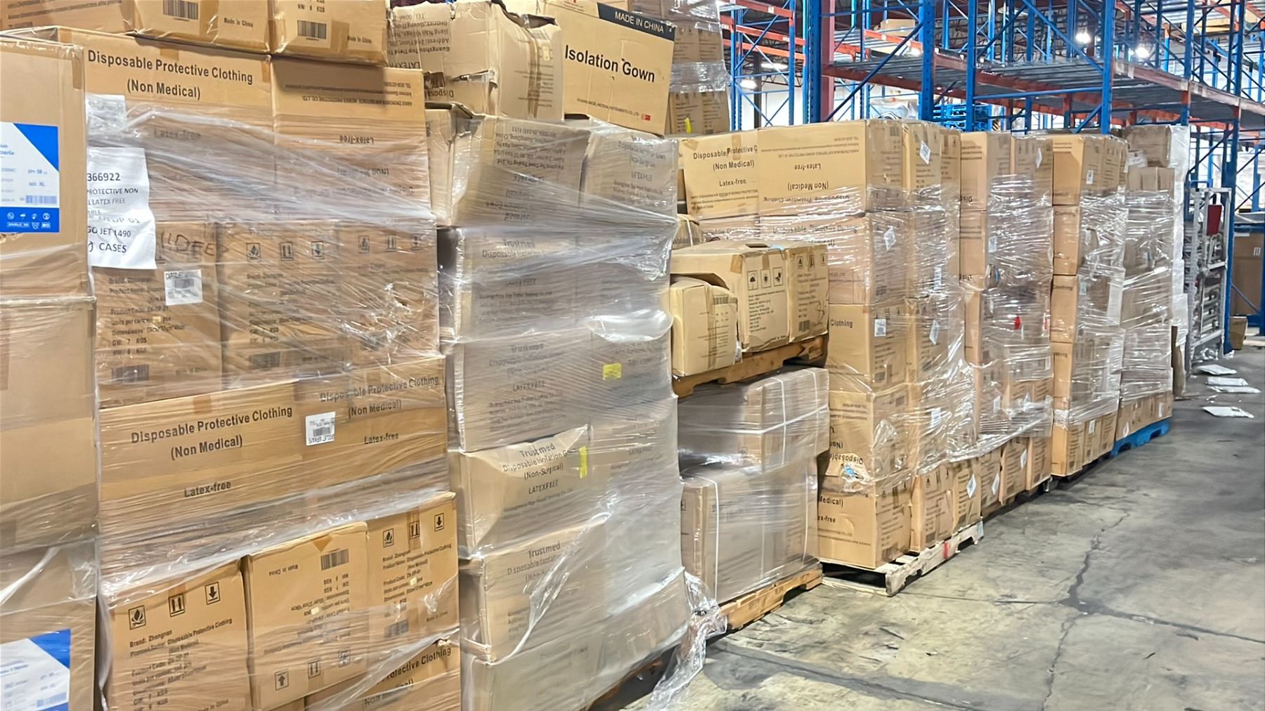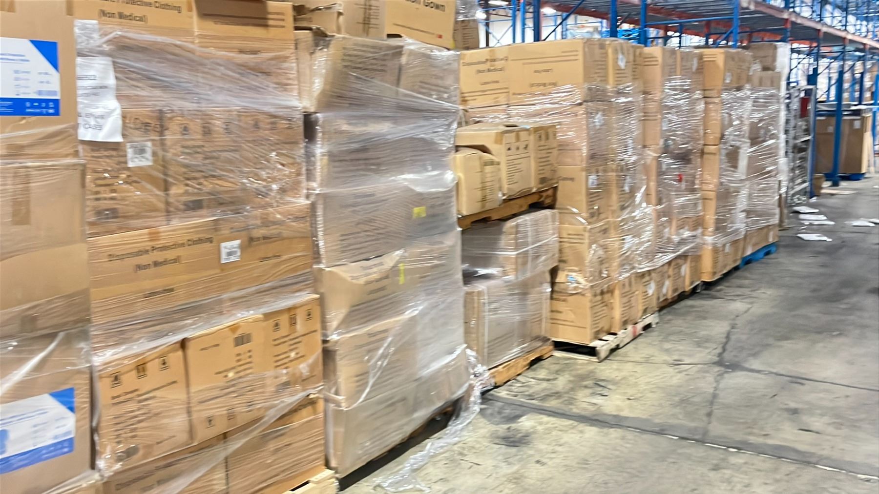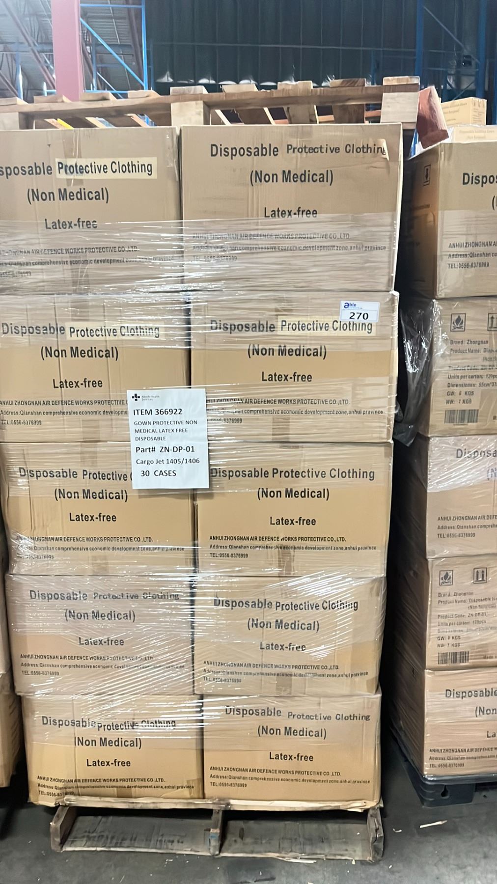 8 PALLET OF DISPOSABLE PROTECTIVE GOWNS (NON MEDICAL) - APPROX. 30 BOXES PER PALLET/120 PCS. PER BOX
