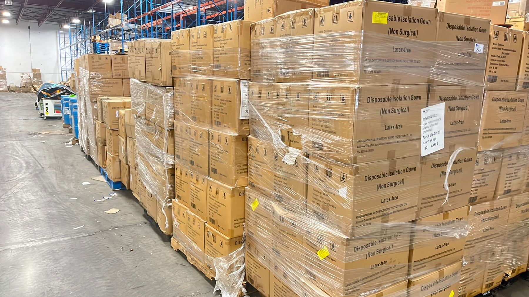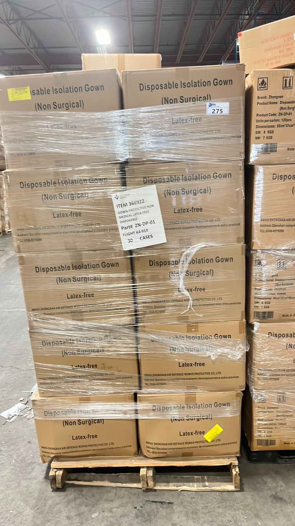 8 PALLET OF DISPOSABLE PROTECTIVE GOWNS (NON MEDICAL) - APPROX. 30 BOXES PER PALLET/120 PCS. PER BOX