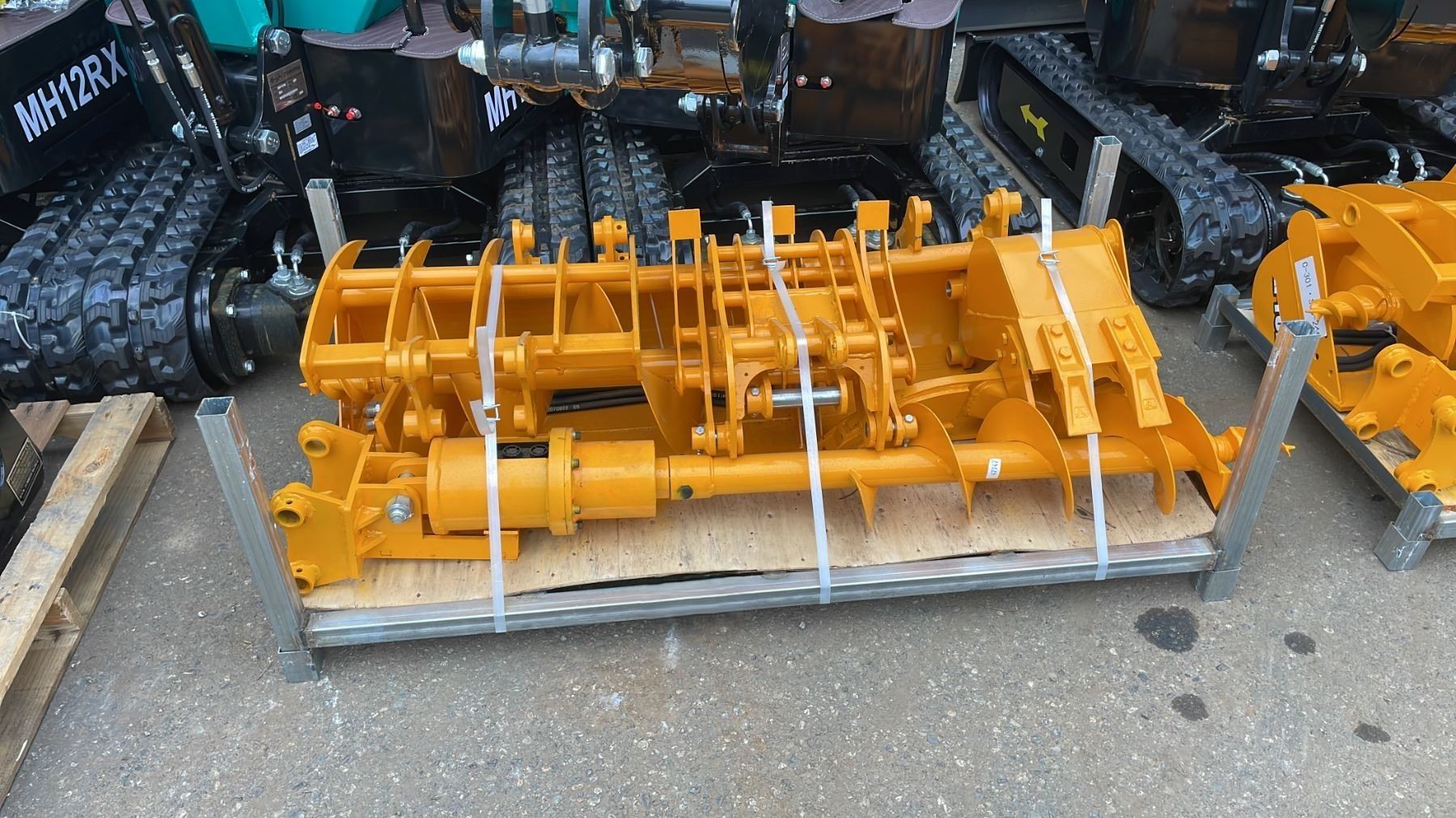 8 PCS 301 YELLOW MINI EXCAVATOR MULTI ATTACHMENT SET INCLUDING SMALL DIGGING / CLEANING BUCKETS 200MM, BUCKET, 800MM CLEANING BUCKET, GRABBER CLAW, 600MM CLEANING BUCKET, 20CM AUGER, AUGER BIT, GRASS RAKE, & RIPPER ATTACHMENT