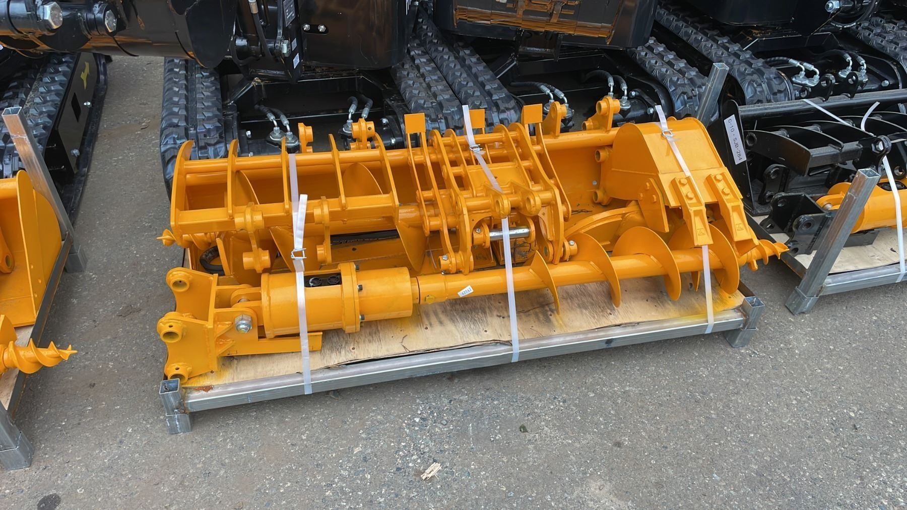 8 PCS 301 YELLOW MINI EXCAVATOR MULTI ATTACHMENT SET INCLUDING SMALL DIGGING / CLEANING BUCKETS 200MM, BUCKET, 800MM CLEANING BUCKET, GRABBER CLAW, 600MM CLEANING BUCKET, 20CM AUGER, AUGER BIT, GRASS RAKE, & RIPPER ATTACHMENT