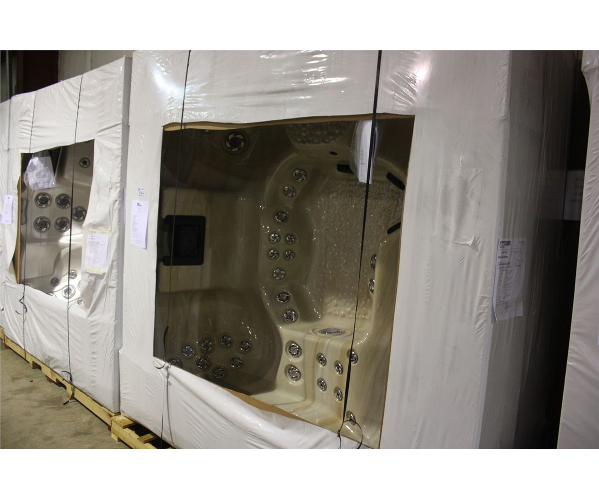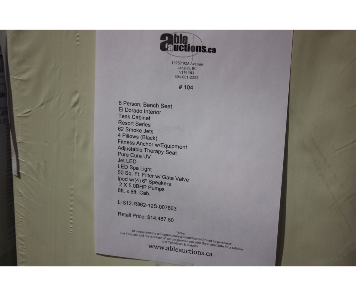 8 PERSON, BENCH SEATING, EL DORADO, TEAK CABINET, 62 SMOKE JETS, 4 PILLOWS, FITNESS ANCHOR W/EQUIP. ADJ THERAPY SEAT, LED SPA LIGHTING, ISOUND IPOD STATION W/4 6" SPEAKERS, 2X5HP PUMPS 8FTX8FT CABINET L-S12-R862-12S-007863