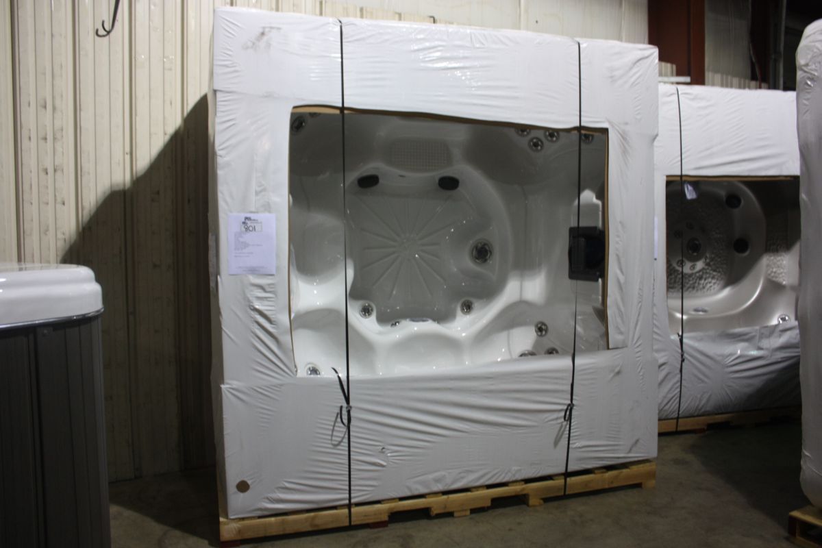 8 PERSON, BENCH SEATING, SNOW WHITE, MIST CABINET 61 JETS, 4PILLOWS, OZONATOR, PERIMETER LED LIGHTING, ISOUND IPOD STATION W/ 2 4" SPEAKERS, THERMO LATER CABINET APPROX. 8FT. X 8FT. CAB. L-S11-ES861B-S-11S-000926