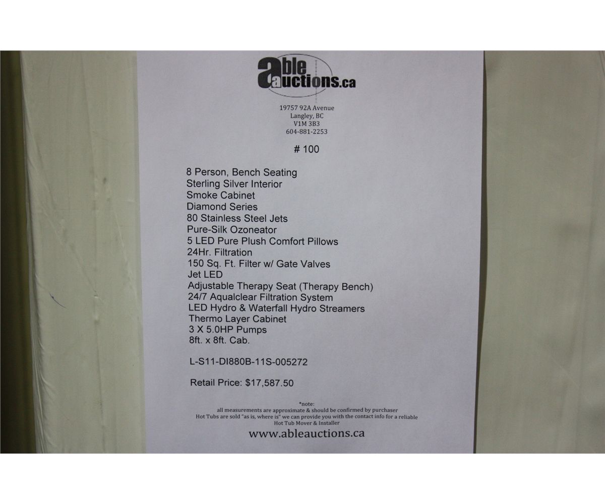 8 PERSON, BENCH SEATING, STERLING SILVER, SMOKE CABINET, 80SS JETS, OZONATOR, 5 LED PUREPLUSH COMFORT PILLOWS, 24HR FILTRATION, ADJUSTABLE THERAPY SEAT, THERMO LAYER CABINET, 3.5HP PUMP 8FTX8FT CABINET L-S11-D1880B-11S-005272