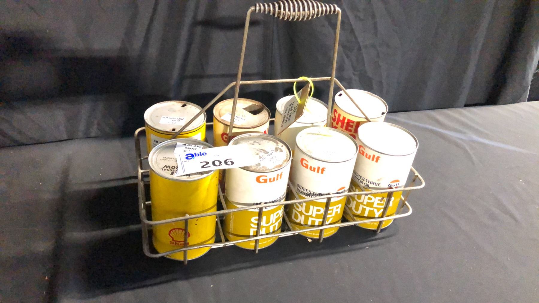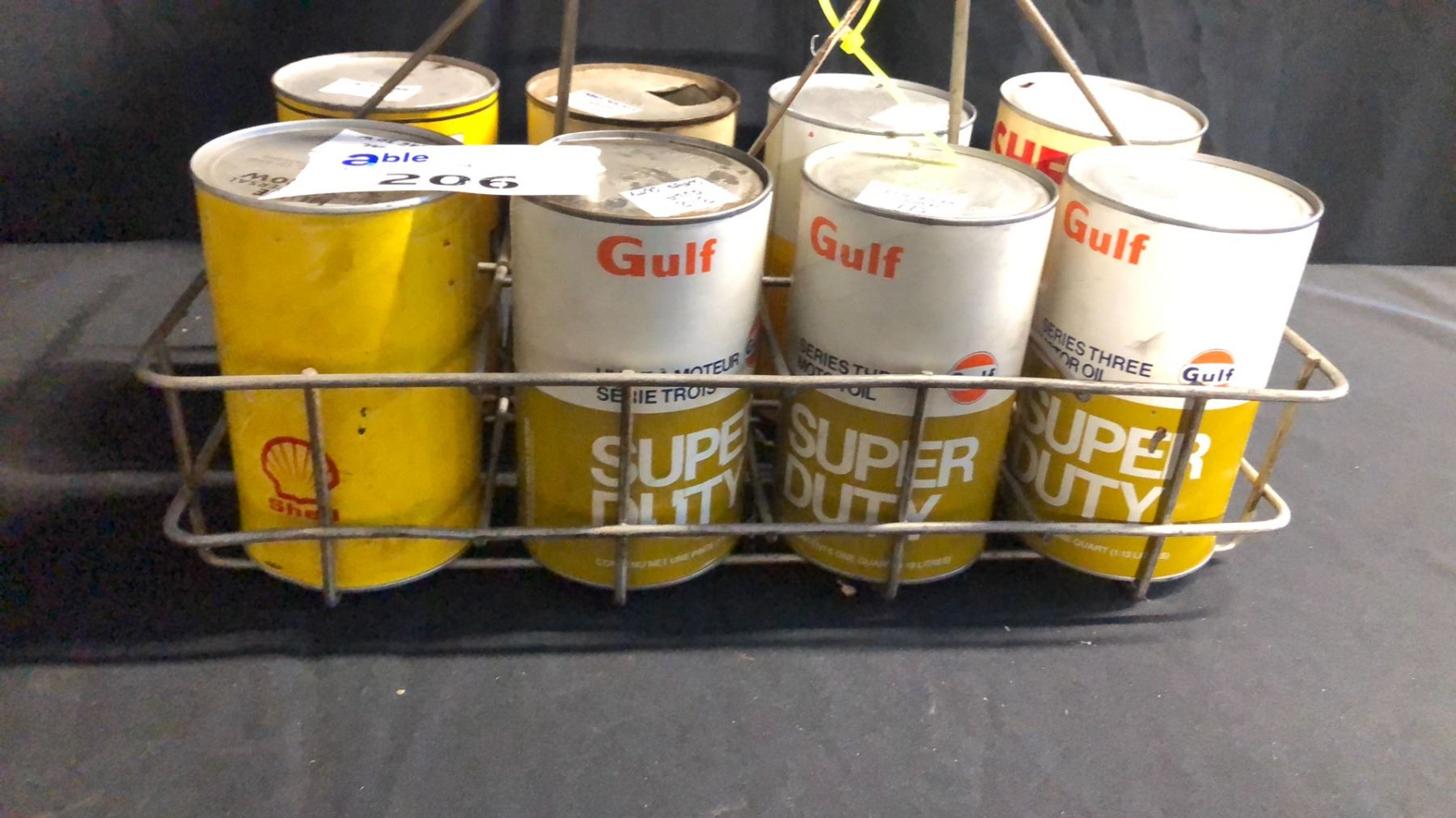 8 POCKET WIRE RACK WITH ASSORTED QUART MOTOR OIL 4 SEALED W/ CONTENTS