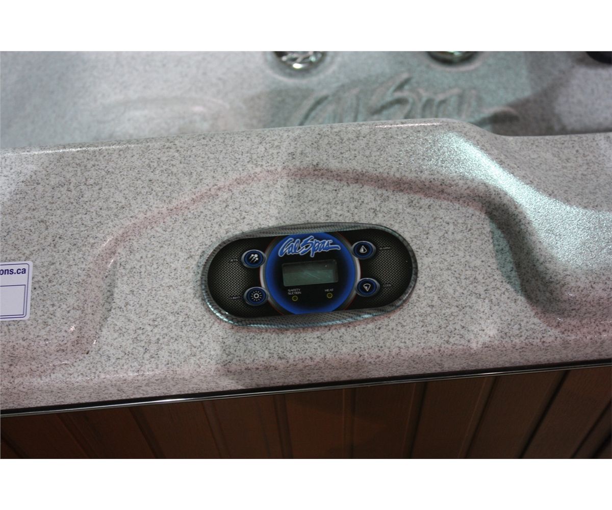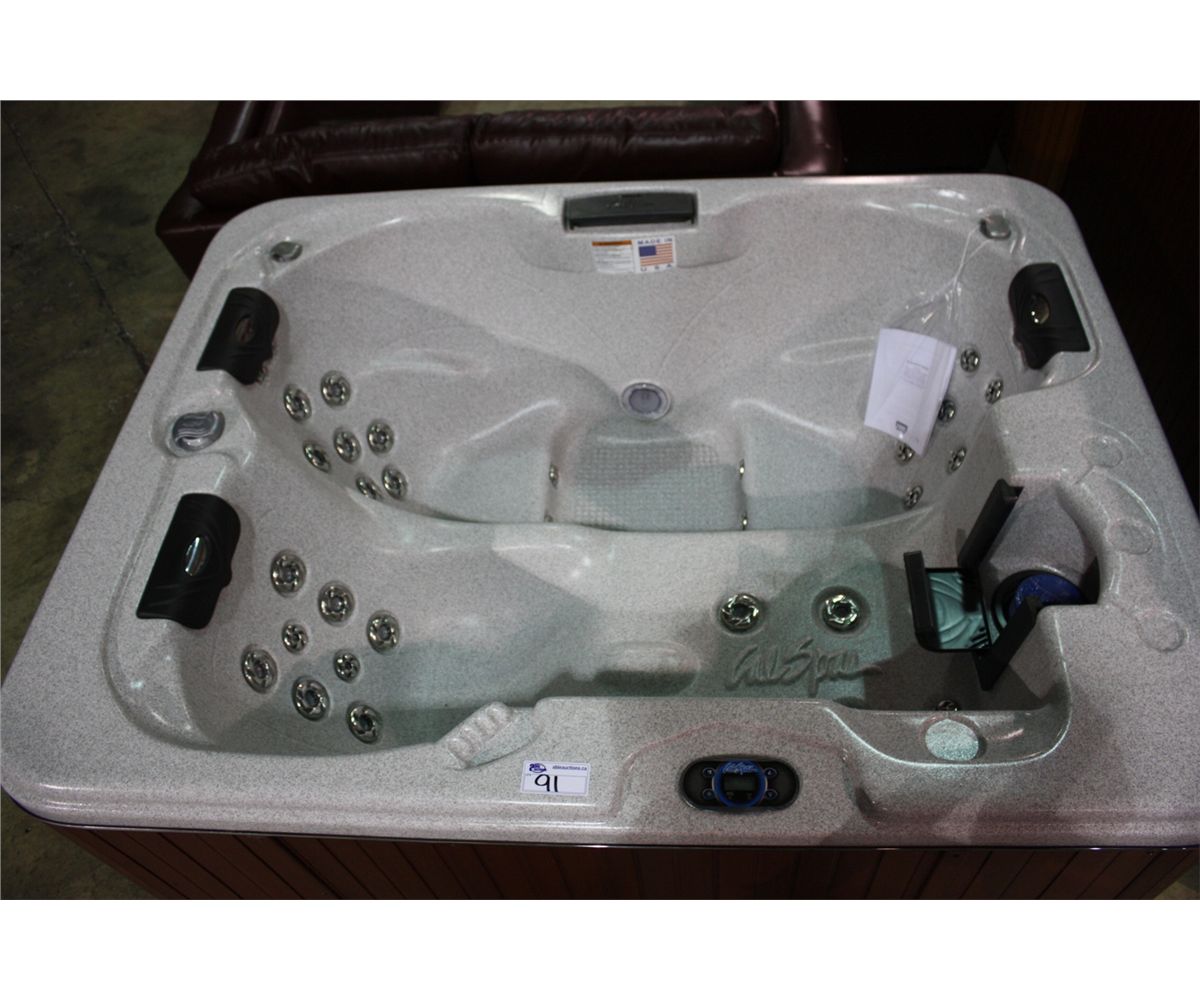 82" X 62" CAL SPAS ESCAPE SERIES HOT TUB WITH SAHARA INTERIOR AND MAHOGANY CABINET. INCLUDES: DOUBLE LOUNGER, 36 SS JETS, 5.0 BHP PUMP, 5.5 KW HEATER, BLUE SPA LIGHTING, WATERFALL AND PURE-SILK OZONATOR. MOD. M-S11-ES5361I-11S-000869