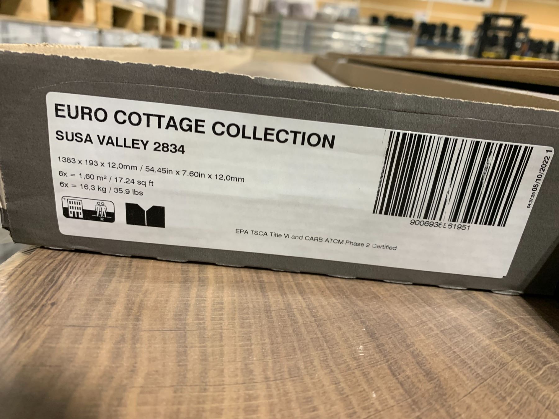 827.52 SQ FT EURO ORIGINAL COTTAGE COLLECTION SUSA VALLEY 2834 12MM LAMINATE PLANK FLOORING 17.24 SQ FT PER BOX 48 BOXES TOTAL 827.52 SQ FT TOTAL * MUST TAKE ALL ON PALLET *