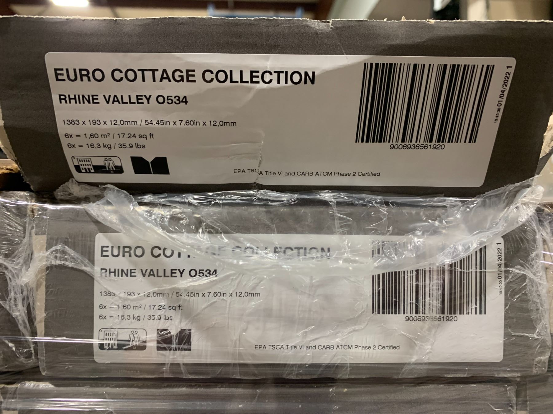 827.52 SQ FT EURO ORIGINAL RHINE VALLEY EURO COTTAGE COLLECTION 12MM GLUELESS LAMINATE FLOORING 17.24 SQ FT PER BOX 48 BOXES TOTAL 827.52 SQ FT TOTAL * MUST TAKE ALL ON PALLET *