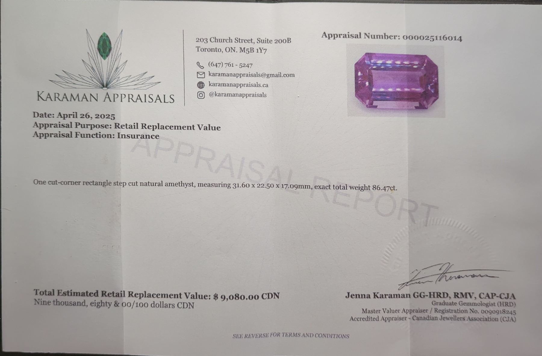 86.47 CT CERTIFIED FANCY AMETHYST GEMSTONE ($9,080 APPRAISAL, APPRAISAL NOT GUARANTEED)