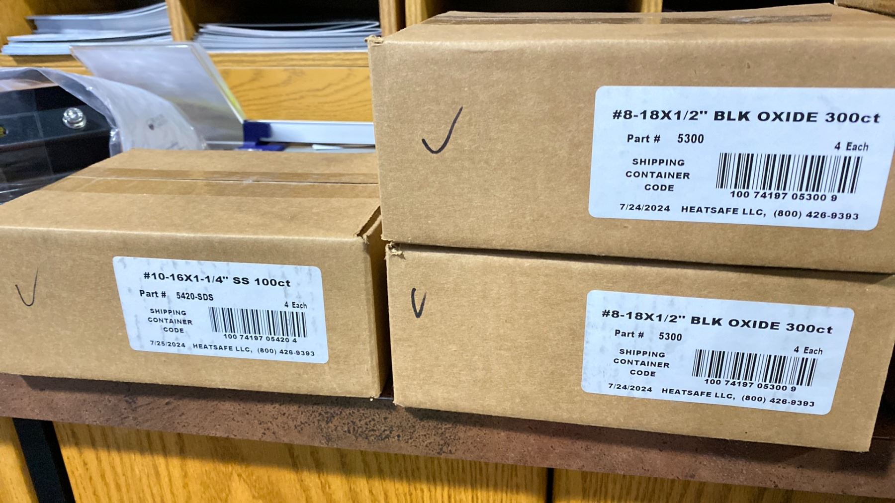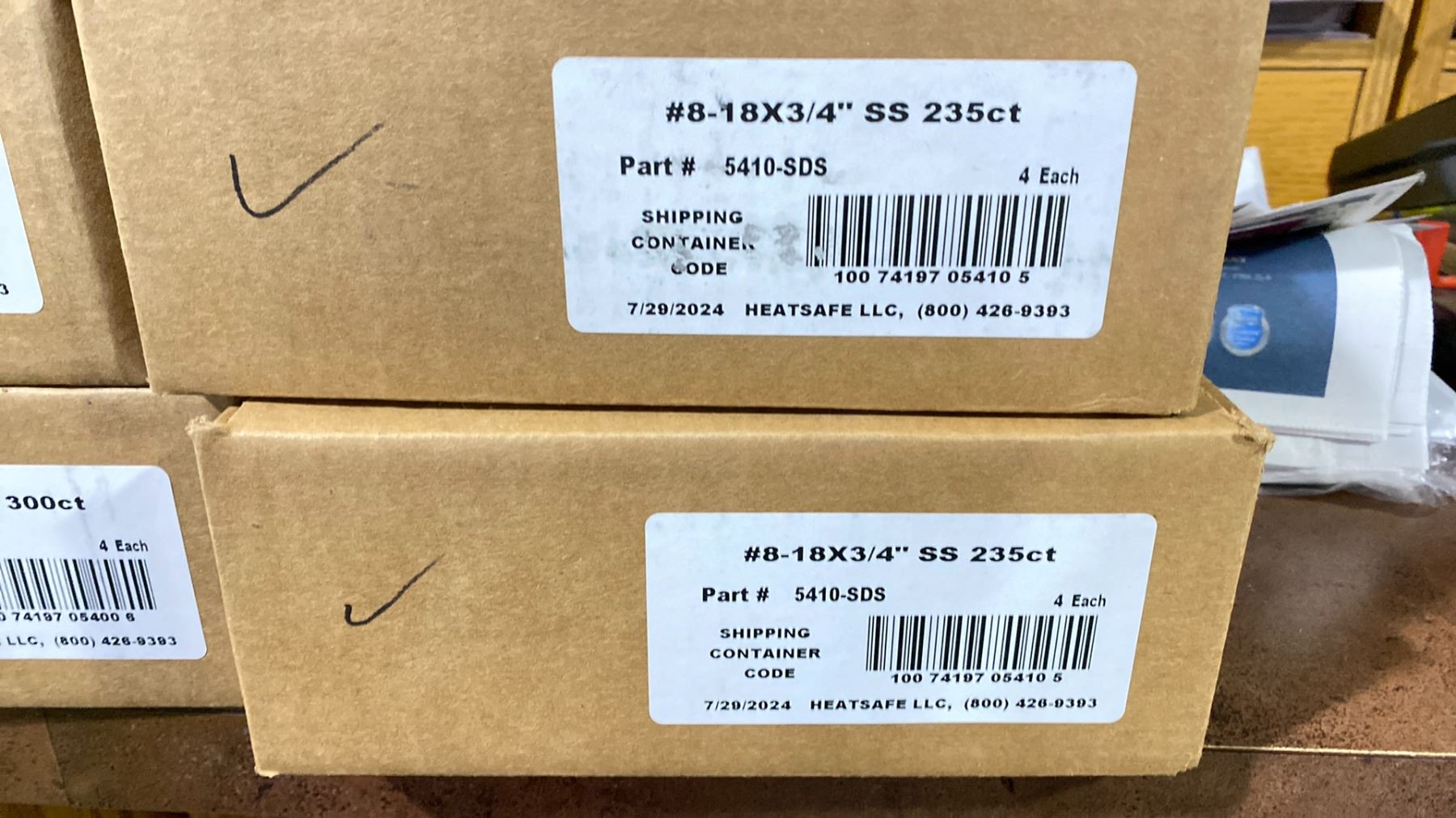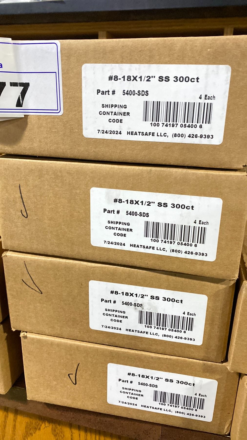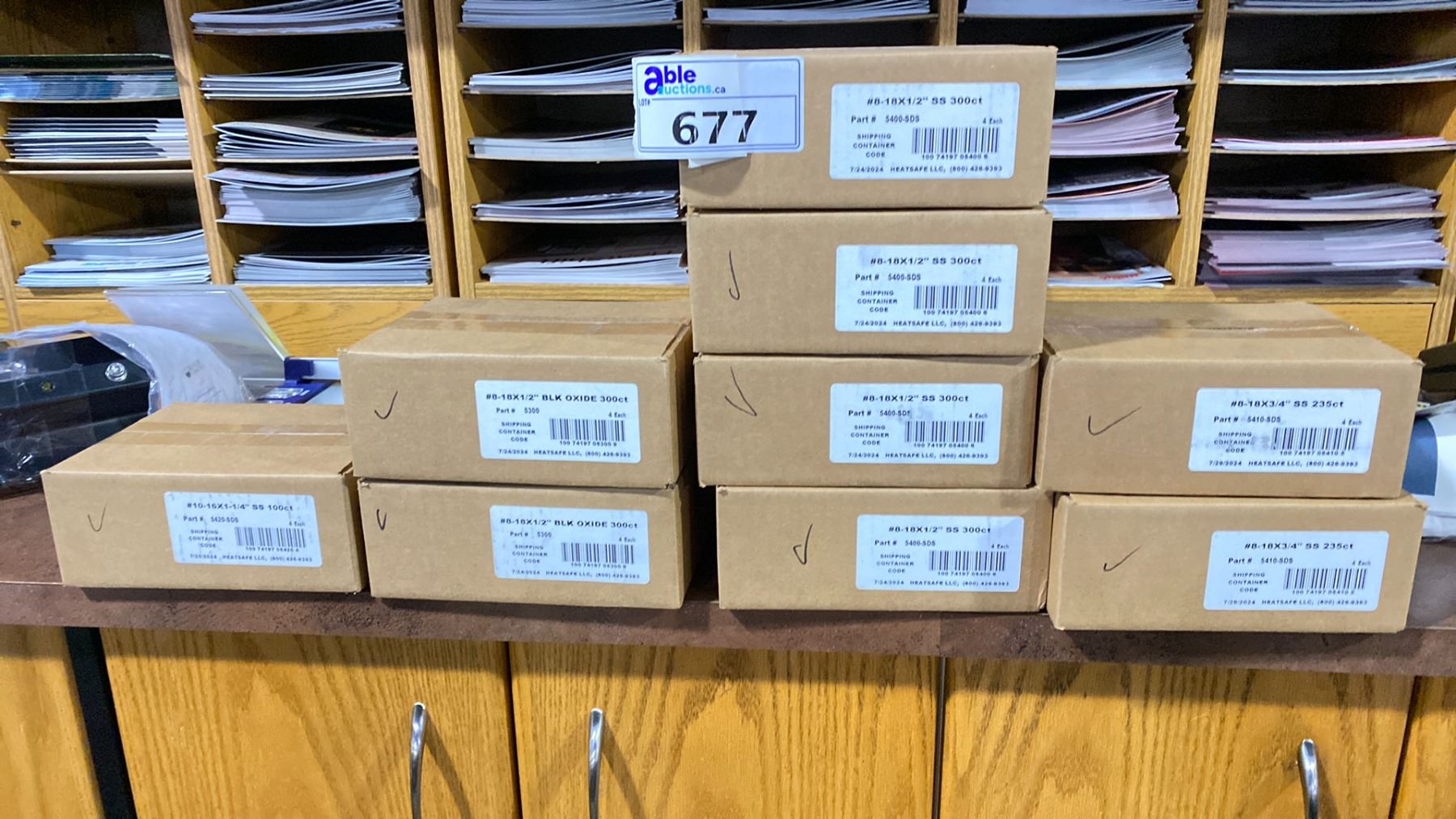 9 BOXES SCREWS. MOSTLY STAINLESS STEEL. 4 X #8-18 X 1/2", 2 X #8-18 X 3/4", 1 X #10-16 X 1-1/4", 2 X BLACK OXIDE #8-18 X 1/2". TOTAL OF 9500 SPECIALTY SCREWS
