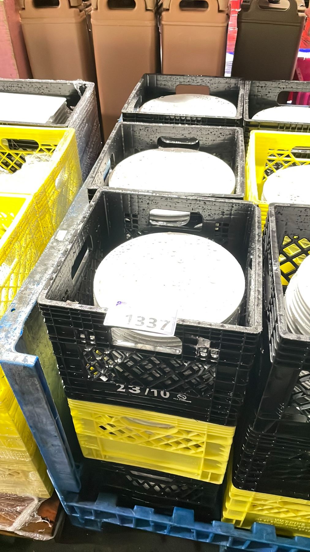 9 CRATES OF WHITE 11" DINNER PLATES & WHITE 12" SOUP PLATES *CRATES INCLUDED*