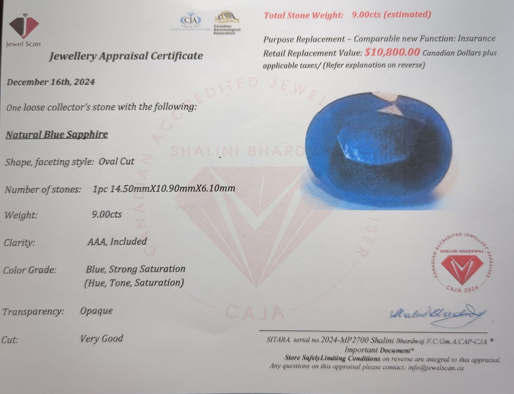 9 CT CERTIFIED BLUE SAPPHIRE GEMSTONE ($10,800 APPRAISAL, APPRAISAL NOT GUARANTEED)
