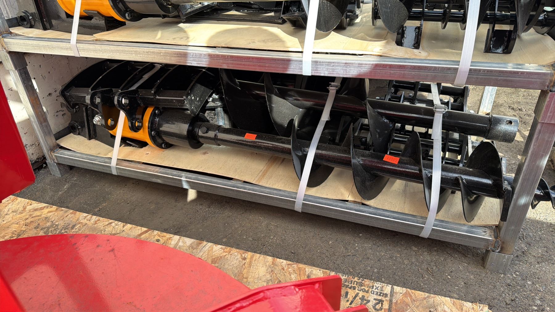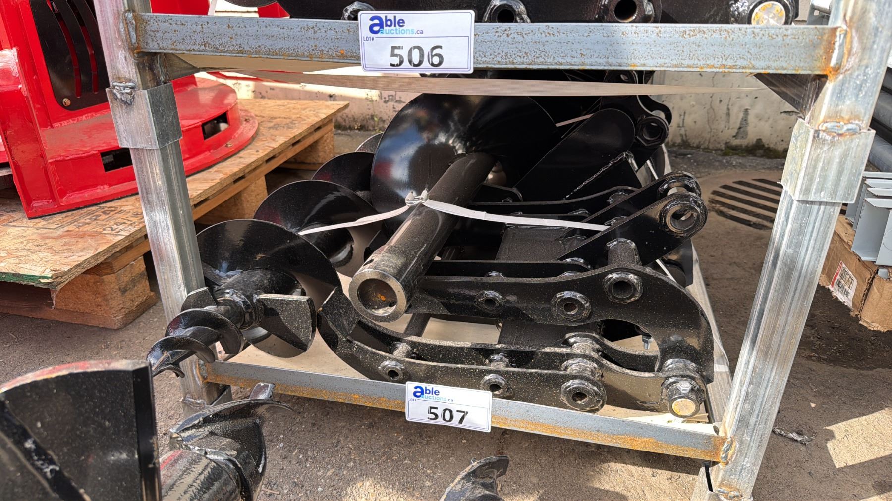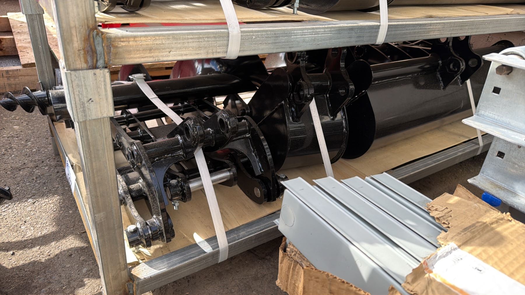 9 PC MINI EXCAVATOR ATTACHMENT SET- 2 BUCKETS, RIPPER, QUICK COUPLER, RAKE, GRAB CLAW, AUGER & 2 RODS