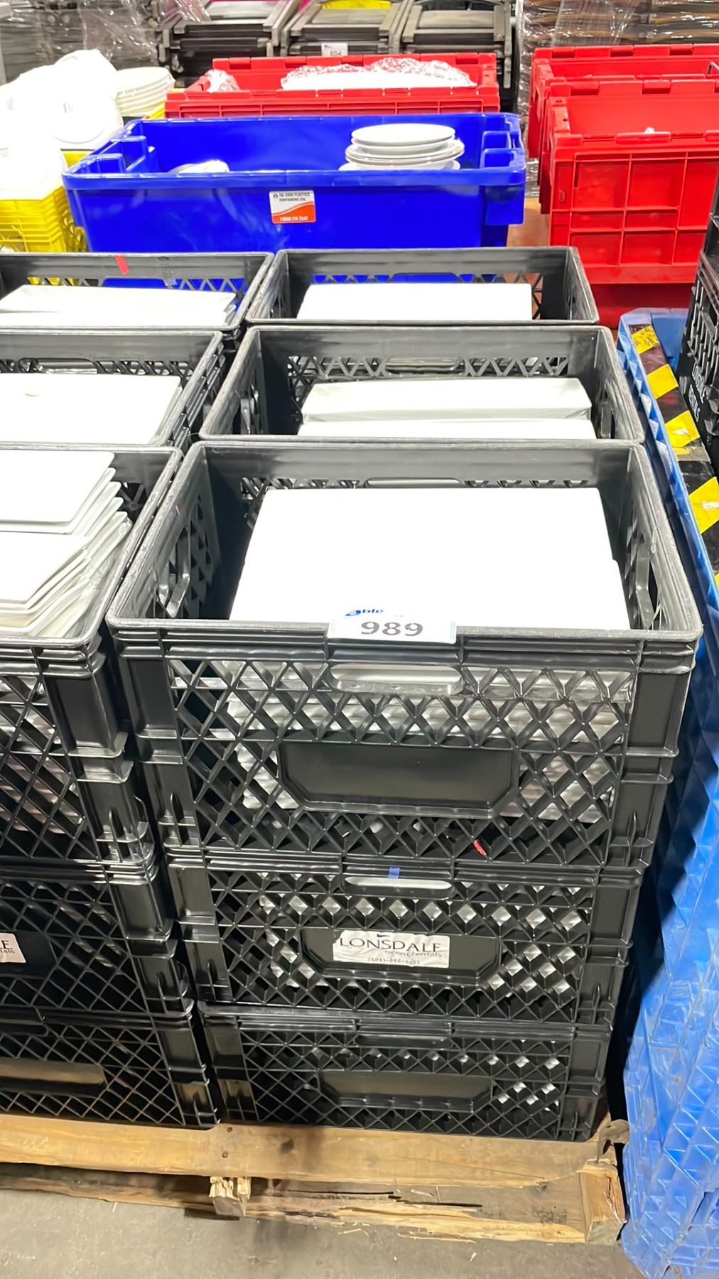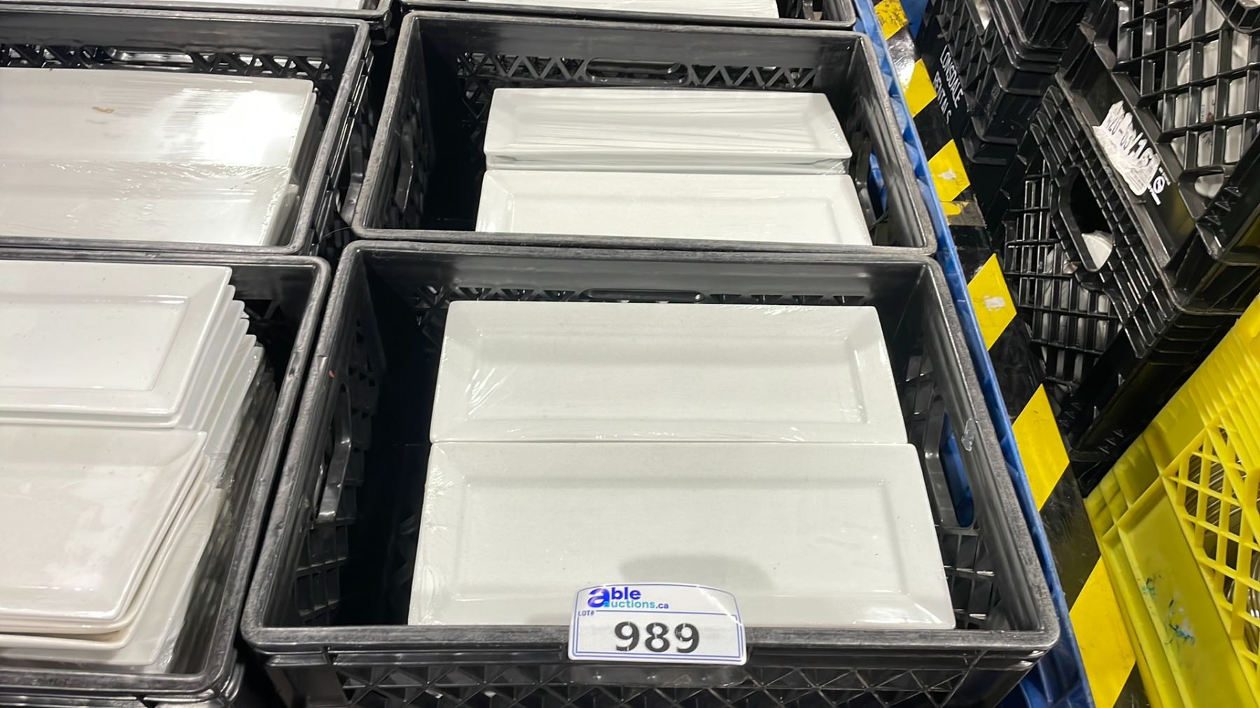 9 PLASTIC CRATES OF 14" WHITE RECTANGULAR COMMERCIAL RESTAURANT APPETIZER PLATES *PLASTIC CRATES INCLUDED* ( APPROX. 30 PLATES PER CRATE )