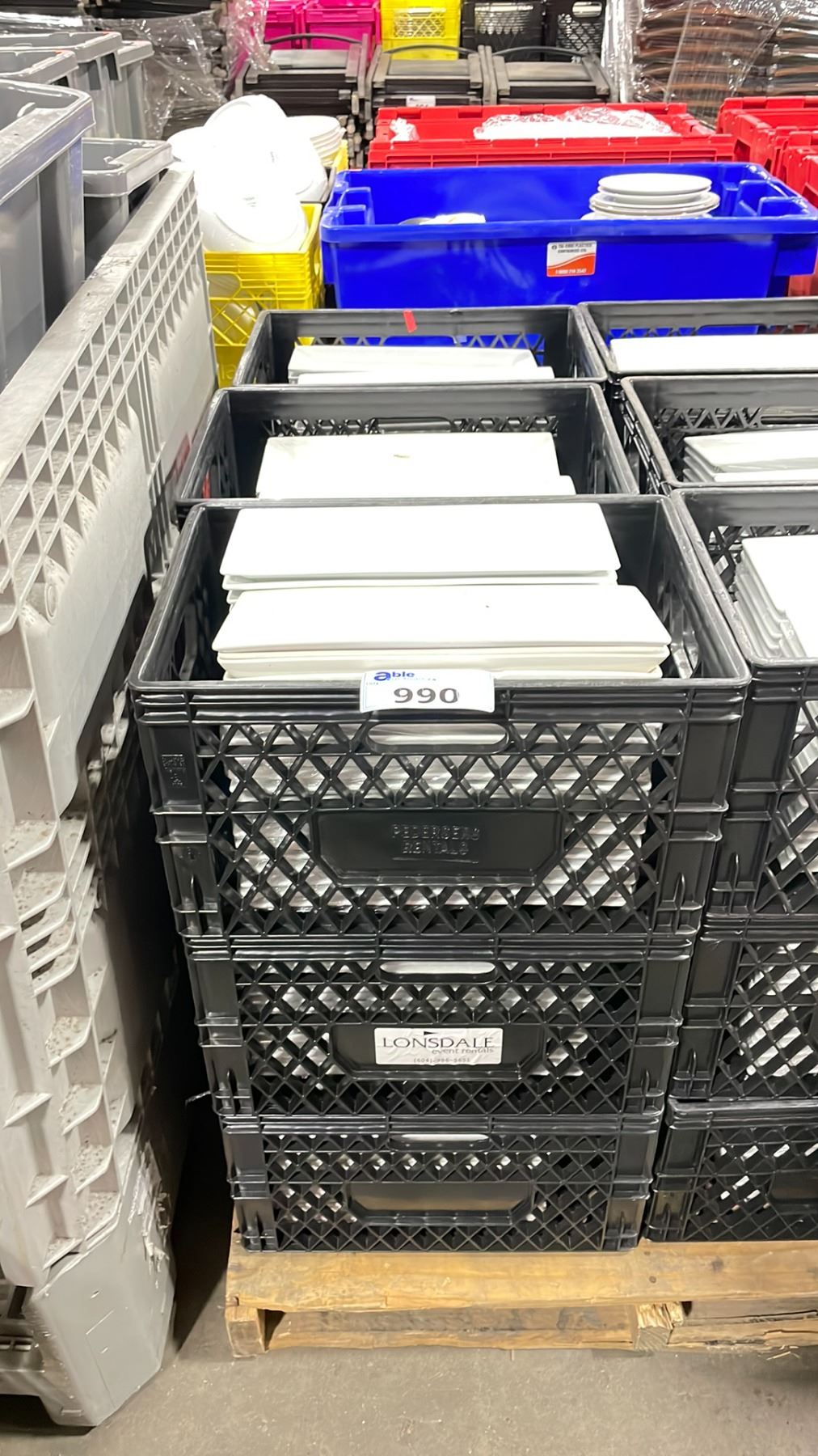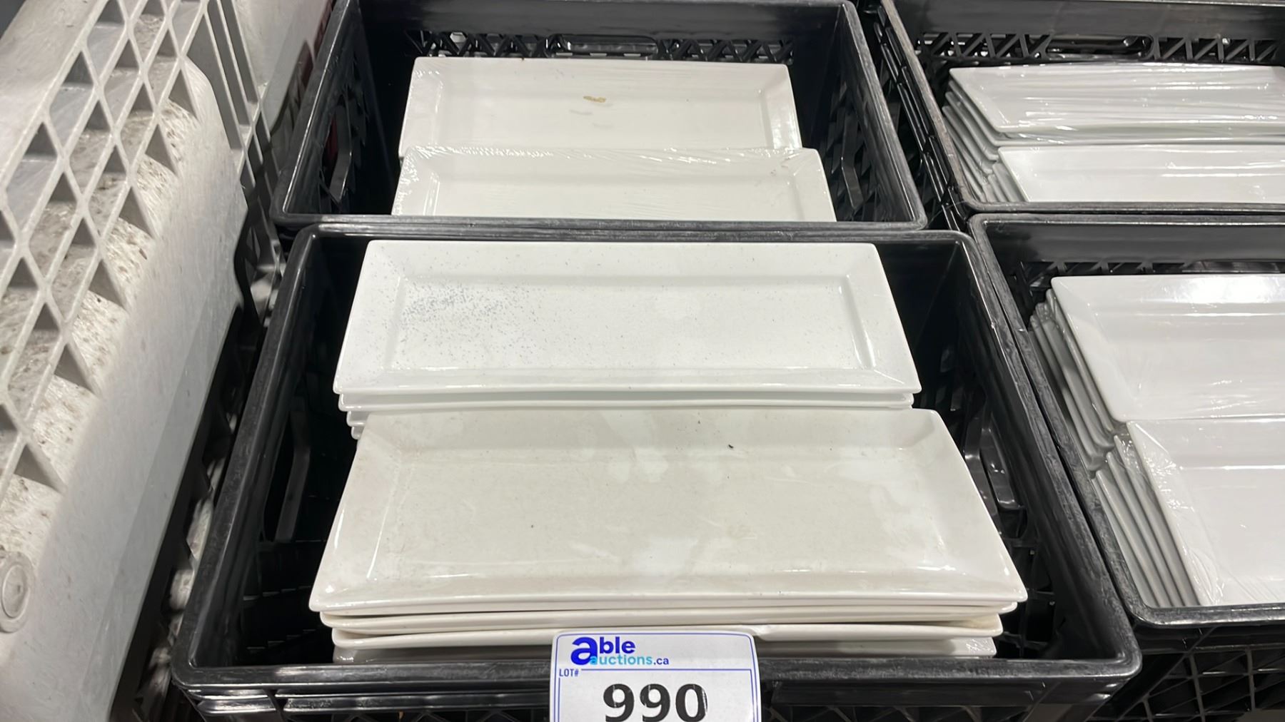 9 PLASTIC CRATES OF 14" WHITE RECTANGULAR COMMERCIAL RESTAURANT APPETIZER PLATES *PLASTIC CRATES INCLUDED* ( APPROX. 30 PLATES PER CRATE )
