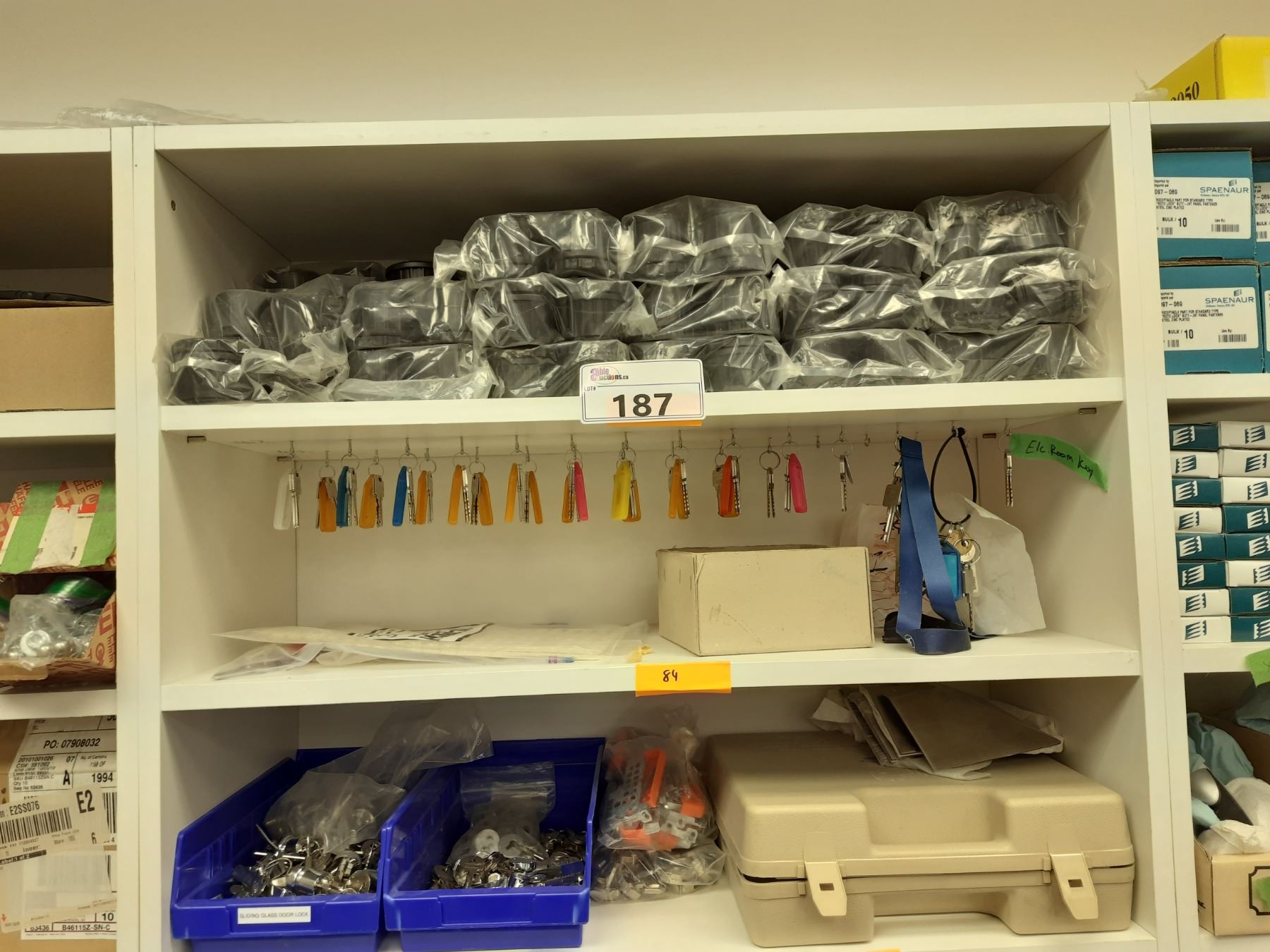 9 SHELVES OF ASSORTED HARDWARE INCLUDING NUTS, BOLTS, LOCKS, DOOR HANDLES, DOOR STOPS, AND CLAMPS