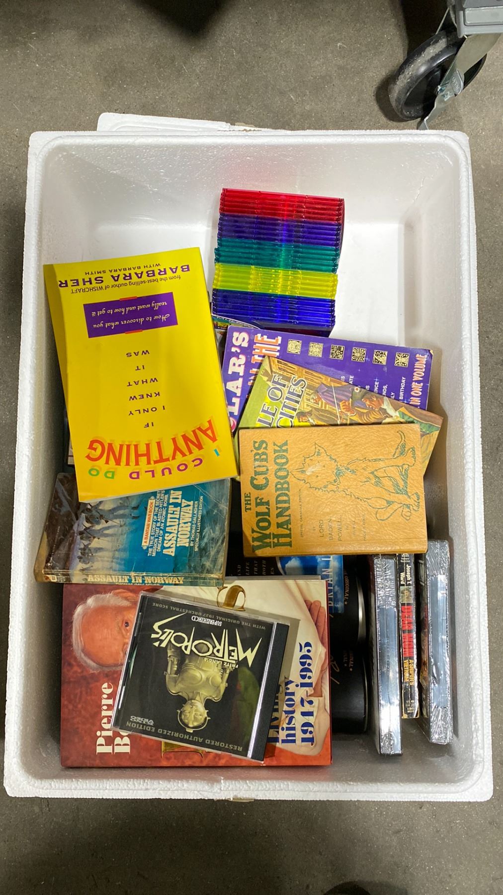 9 WHITE FOAM COOLERS WITH ASSORTED BOOKS, DVDS, CDS & HOME DECOR ITEMS * TABLE NOT INCLUDED *