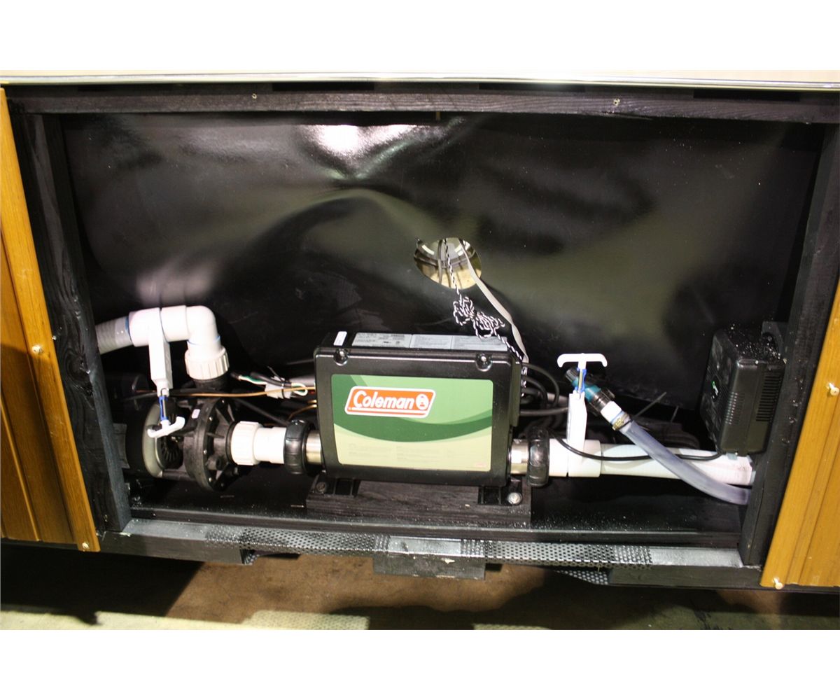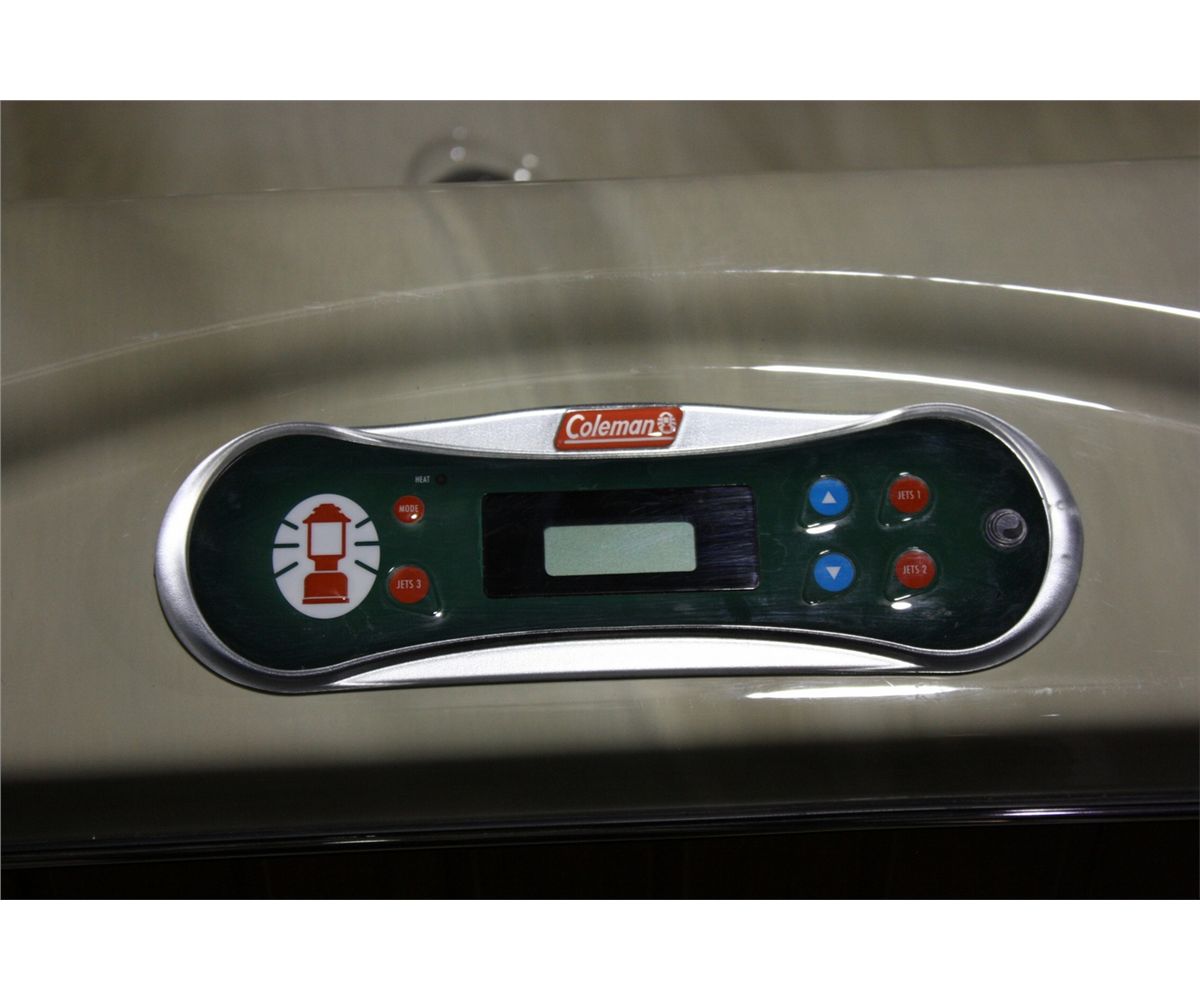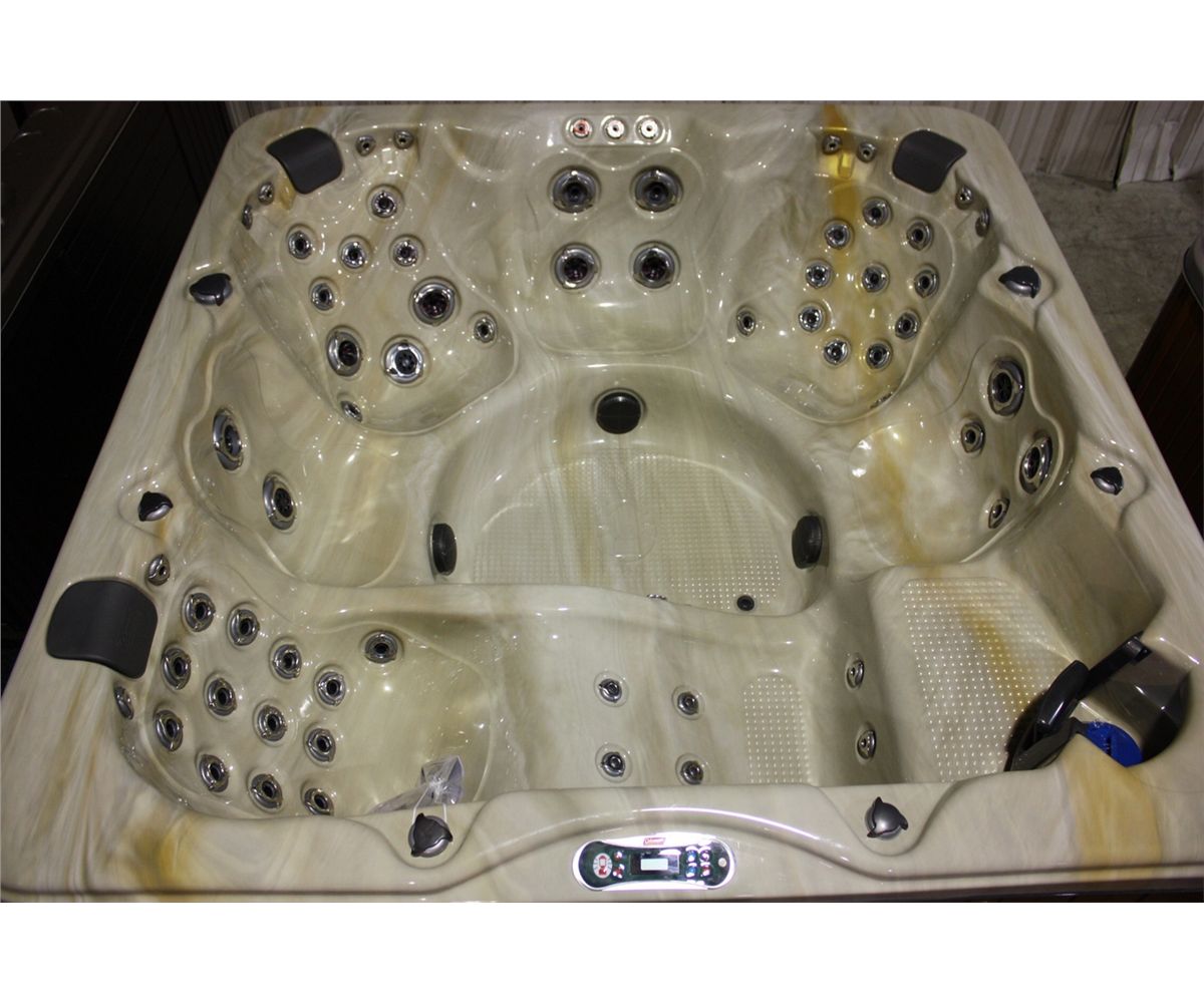 92" X 92" CAL SPAS COLEMAN SERIES HOT TUB WITH EL DORADO INTERIOR AND TEAK CABINET. INCLUDES: 66 SS JETS, LED SPA LIGHT PURE-SILK OZONATOR, THREE PORT LED WATER FEATURE, 3 X 5.0 HP PUMPS, 5.5 KW HEATER, LOUNGER WITH NECK MASSAGE AND 2 CAPTAIN SEATS WITH NECK MASSAGERSMOD. L-S13-CO866L-13S-000057 7 PERSON