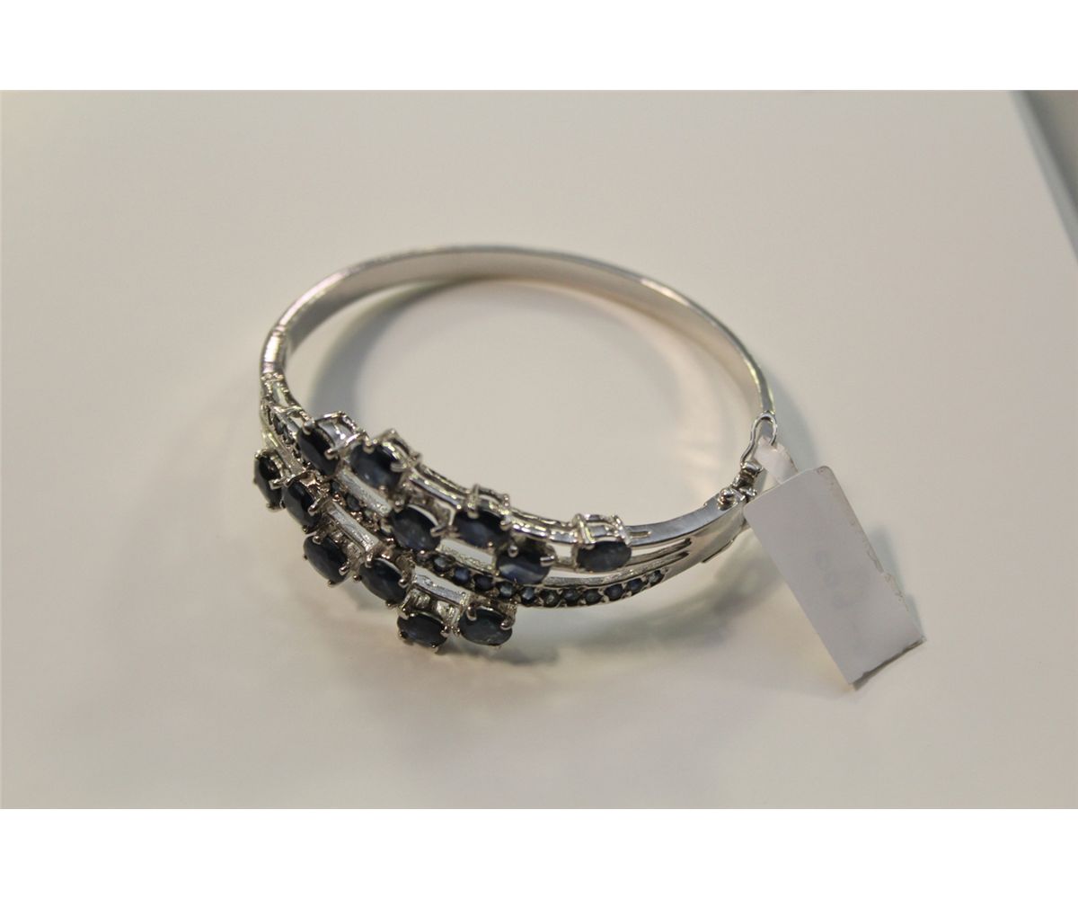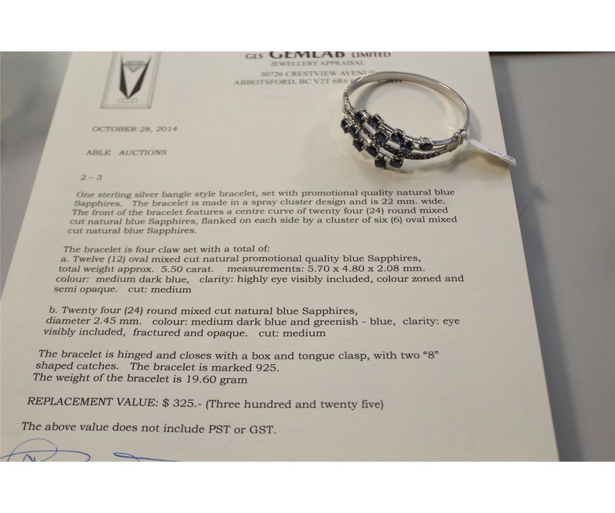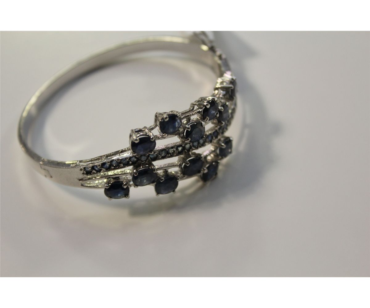 925 STERLING SILVER BANGLE STYLE BRACELET CLAW SET WITH 12 OVAL MIXED CUT NATURAL PROMOTIONAL QUALITY SAPPHIRES APPROX. 5.50 CARATS AND 24 ROUND MIXED CUT NATURAL BLUE SAPPHIRES. REPLACEMENT VALUE: $325.00