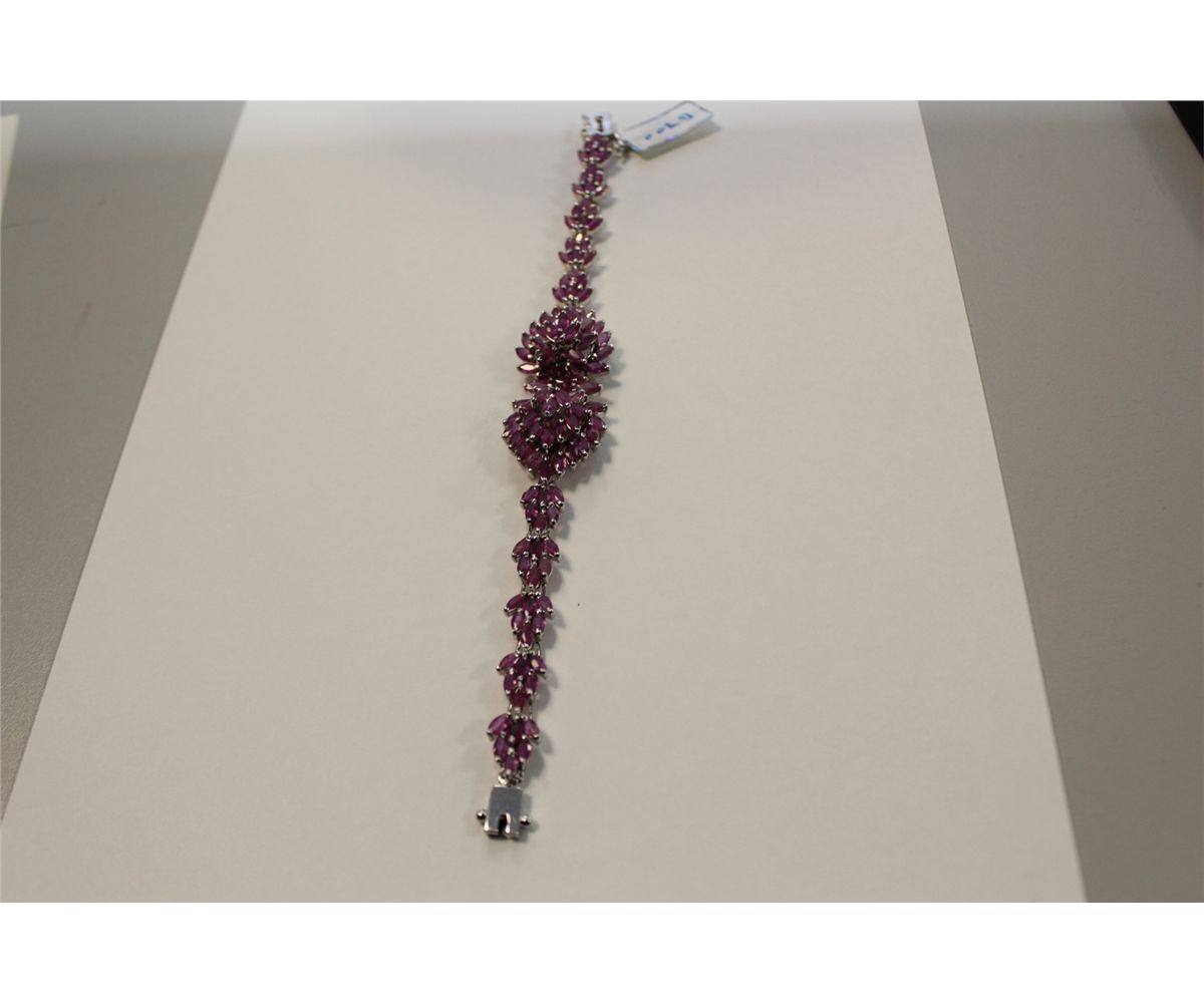 925 STERLING SILVER NATURAL PROMOTIONAL QUALITY PURPLE RUBY-SAPPHIRE BRACELET CLAW SET WITH 118 MARQUISE SHAPED PROMO QUALITY NAUTURAL RUBIES APPROX. 19 CARATS. REPLACEMENT VALUE: $750.00