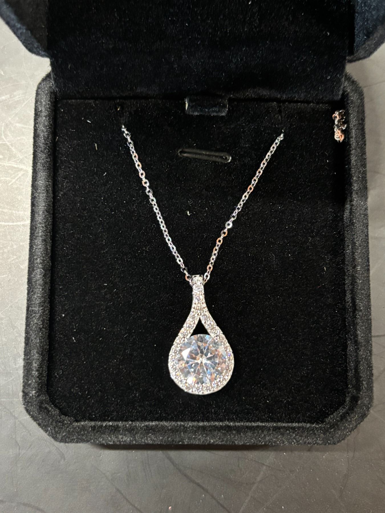 925S 4.0CT SIMULATED DIAMOND (CZ) TEARDROP NECKLACE, ADJUSTABLE 16.5" TO 18" LONG - MOUNTED IN 925 STERLING SILVER WITH WHITE GOLD OVERLAY