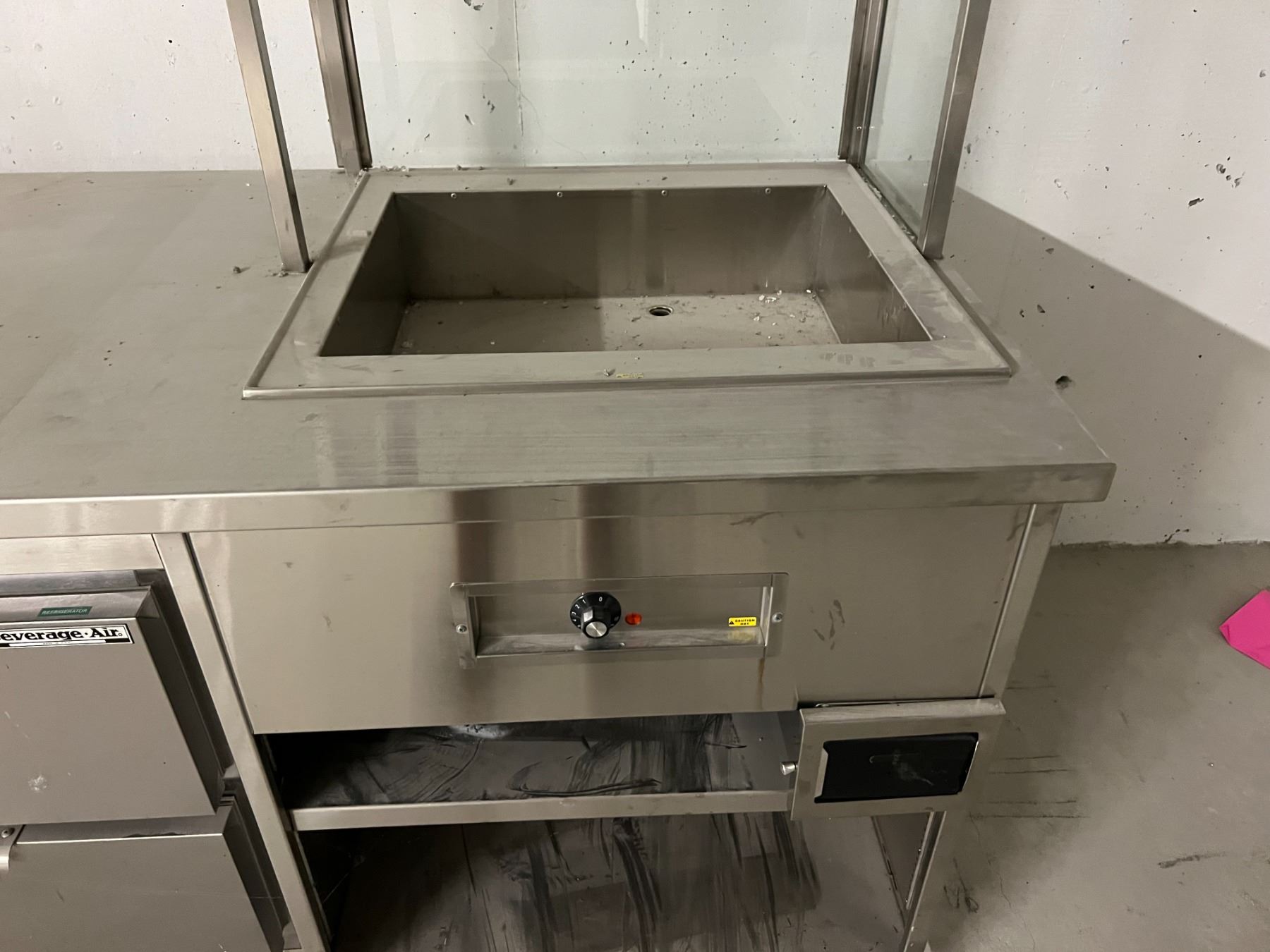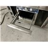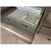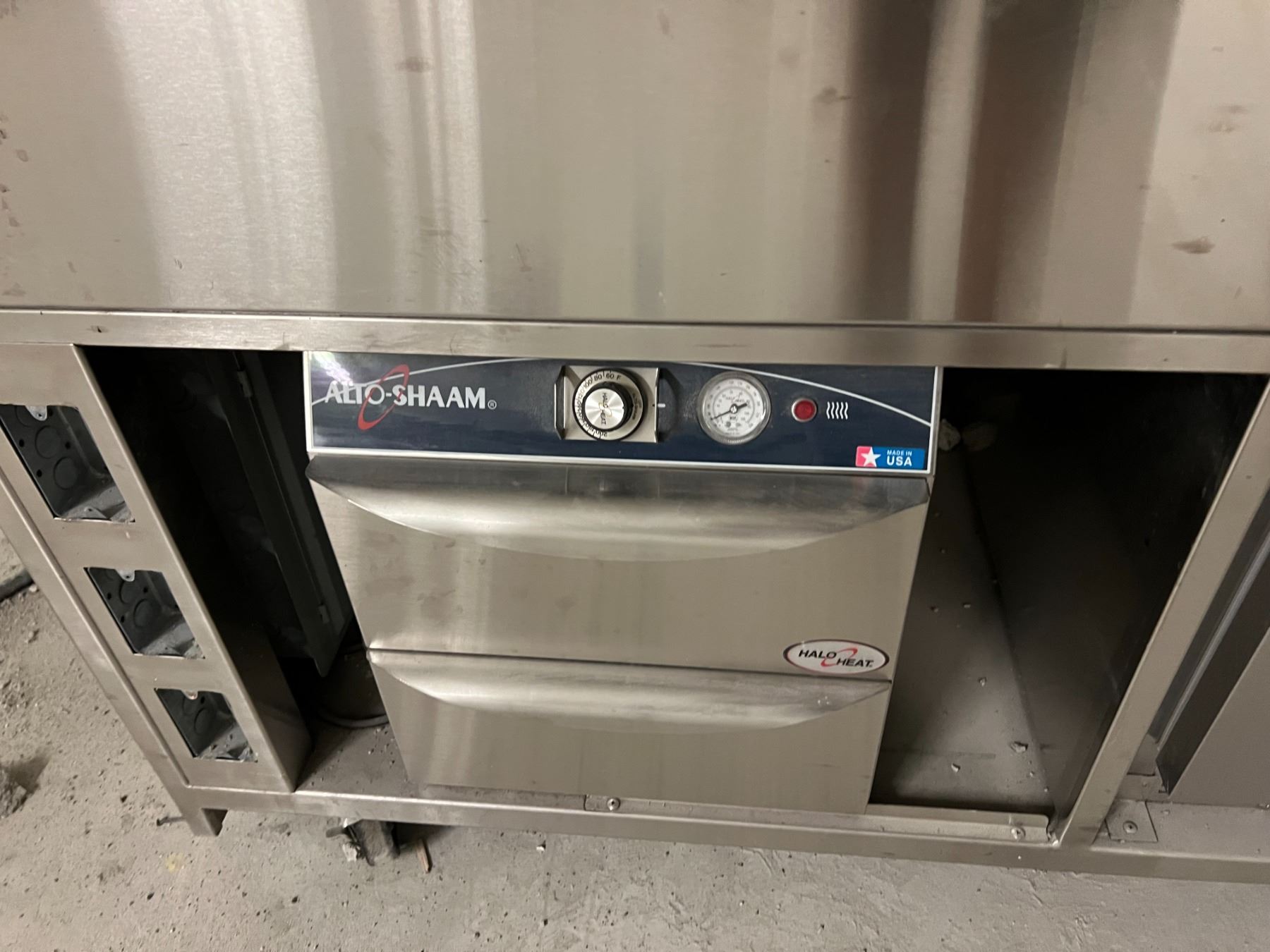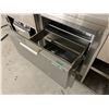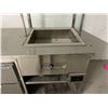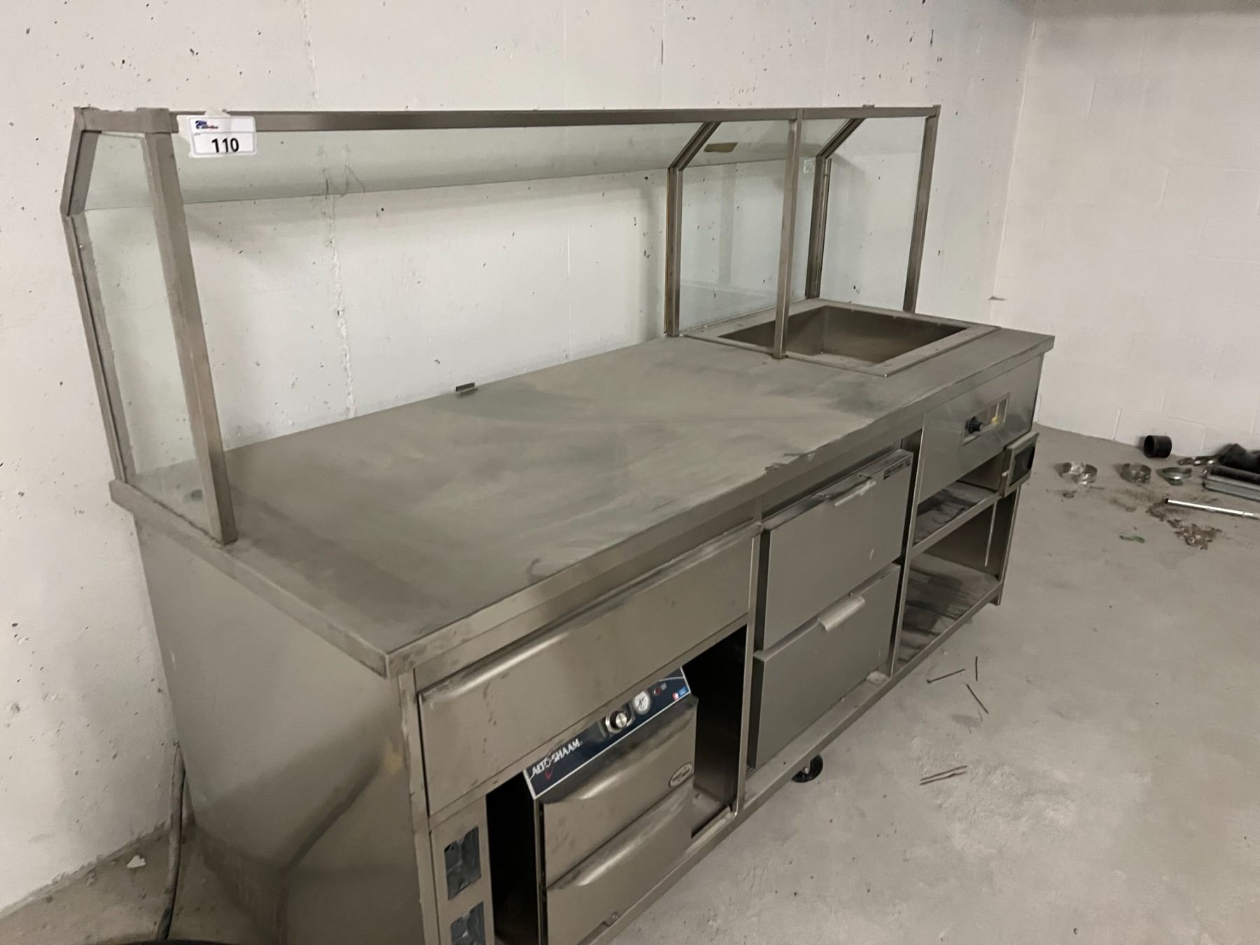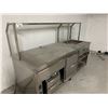 94" X 34" HOT AND COLD STAINLESS SERVING STATION. STEAM TABLE, BEVERAGEAIR COOLED DRAWERS & ALTO-SHAAM HEATED DRAWERS. ROLLING. UNIT IS EXTREMELY DUSTY BUT ACTUALLY LOOKS BRAND NEW