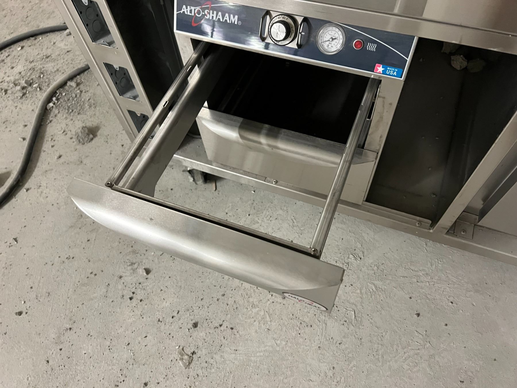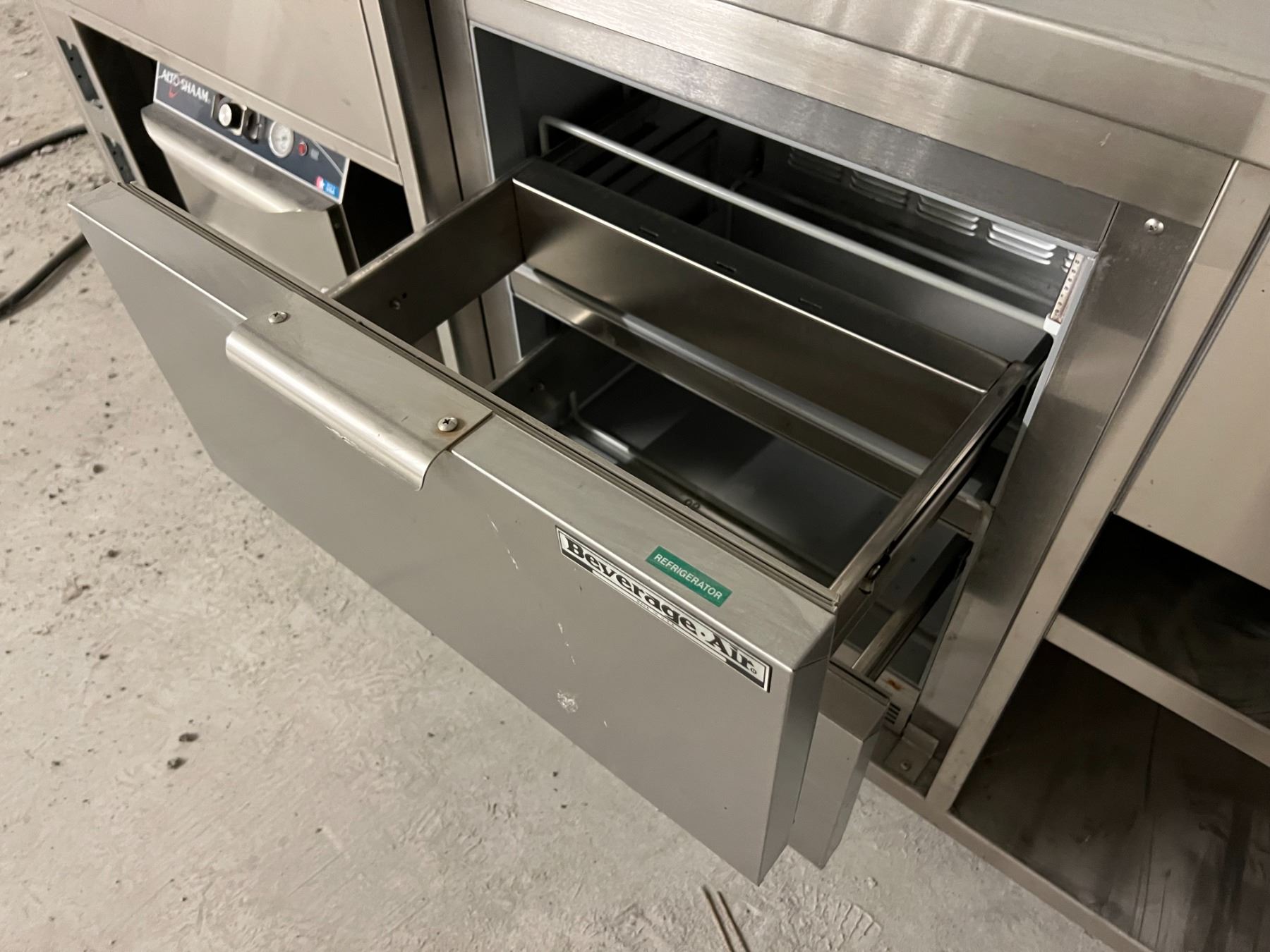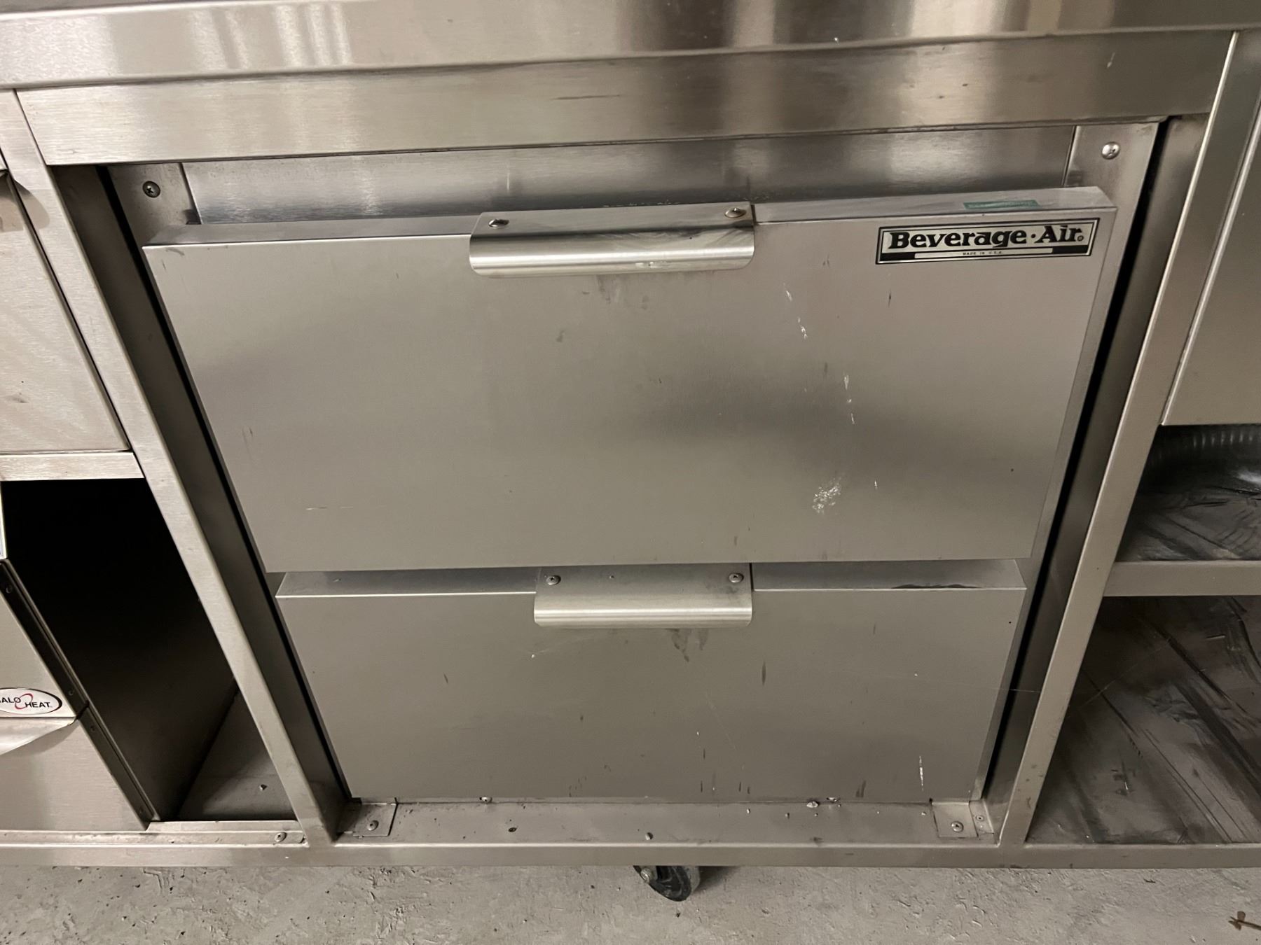 94" X 34" HOT AND COLD STAINLESS SERVING STATION. STEAM TABLE, BEVERAGEAIR COOLED DRAWERS & ALTO-SHAAM HEATED DRAWERS. ROLLING. UNIT IS EXTREMELY DUSTY BUT ACTUALLY LOOKS BRAND NEW