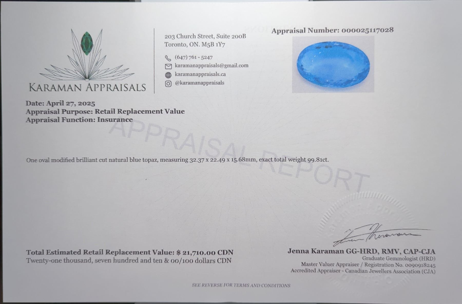 99.81 CT CERTIFIED ROYAL BLUE TOPAZ GEMSTONE ($21,710 APPRAISAL, APPRAISAL NOT GUARANTEED)