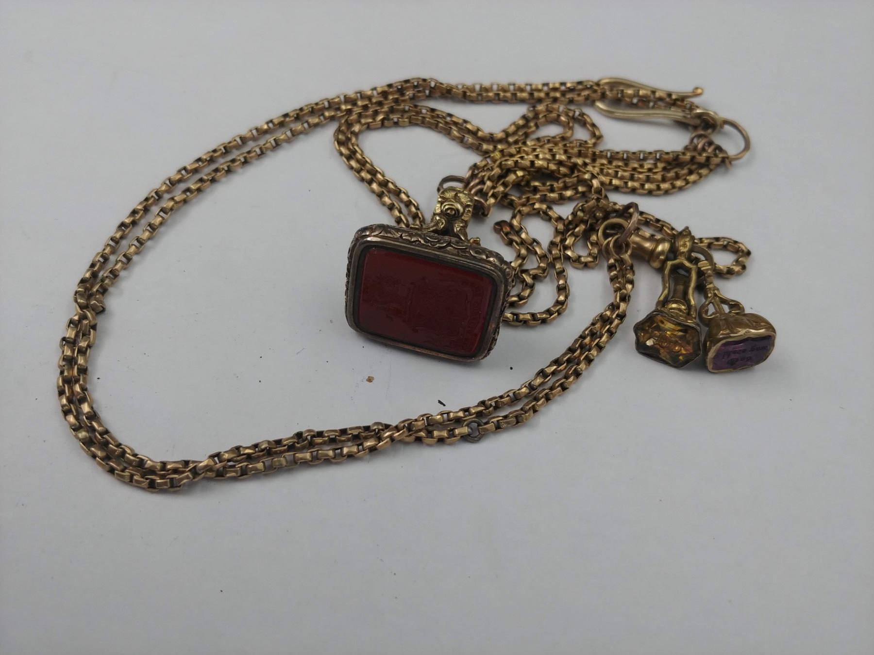9K YELLOW GOLD WATCH CHAIN (BROKEN) WITH FOB SET WITH STONE