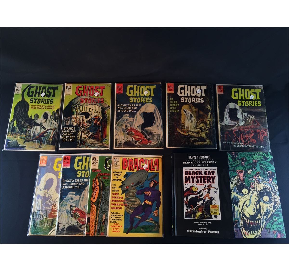 A COLLECTION OF NINE ISSUES OF DELL'S GHOST STORIES SERIES FROM THE EARLY 1970'S S WELL AS A COPY OF DELL'S DRACULA #7 FROM 1972.  SOLID LOWER TO MID-GRADE.  INCLUDED IS A COPY OF OF BLACK CAT MYSTERY #1 LTD. EDITION HARDCOVER SIGNED & NUMBERED BY HORROR WRITER CHRISTOPHER FLOWLER.