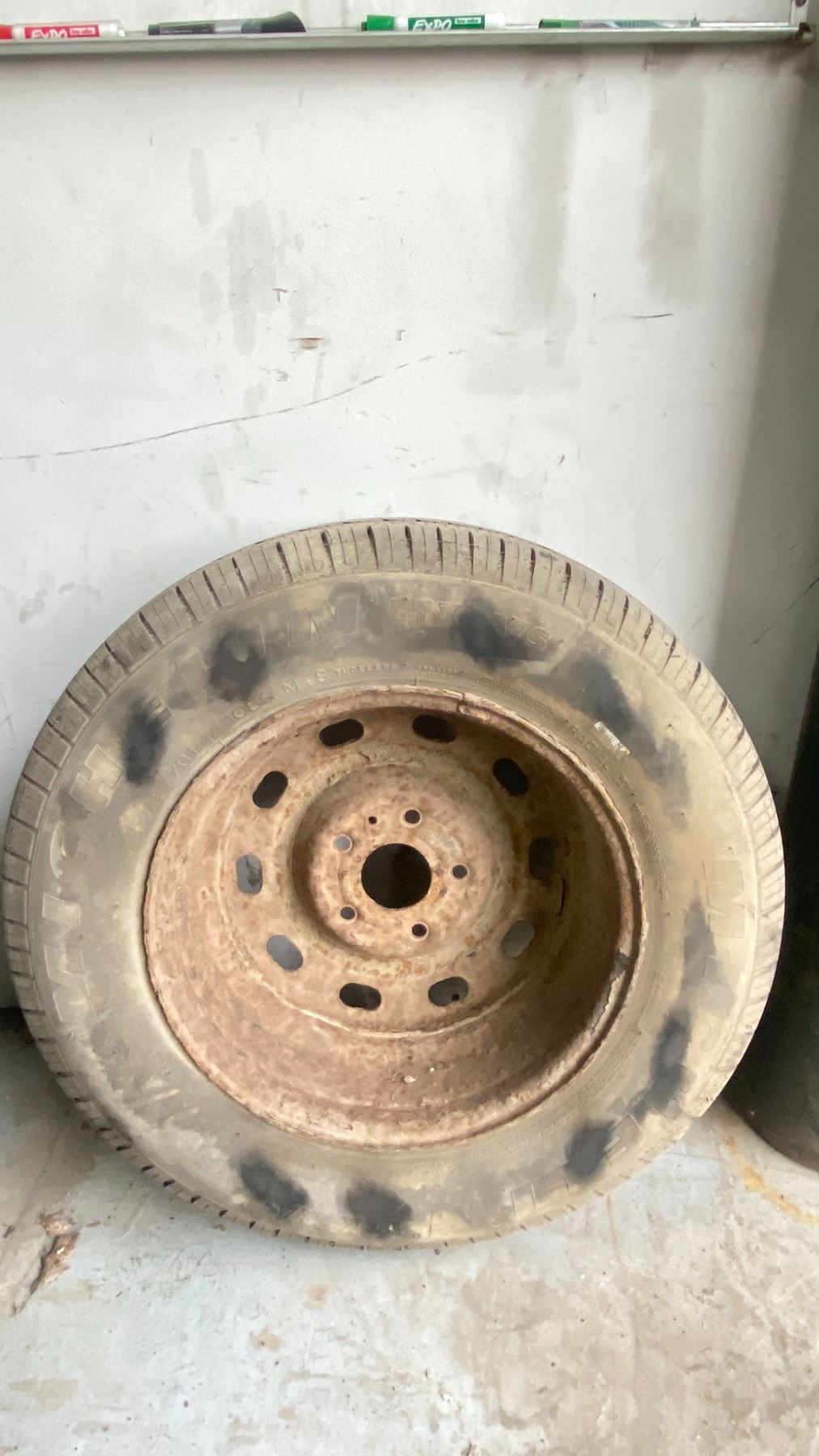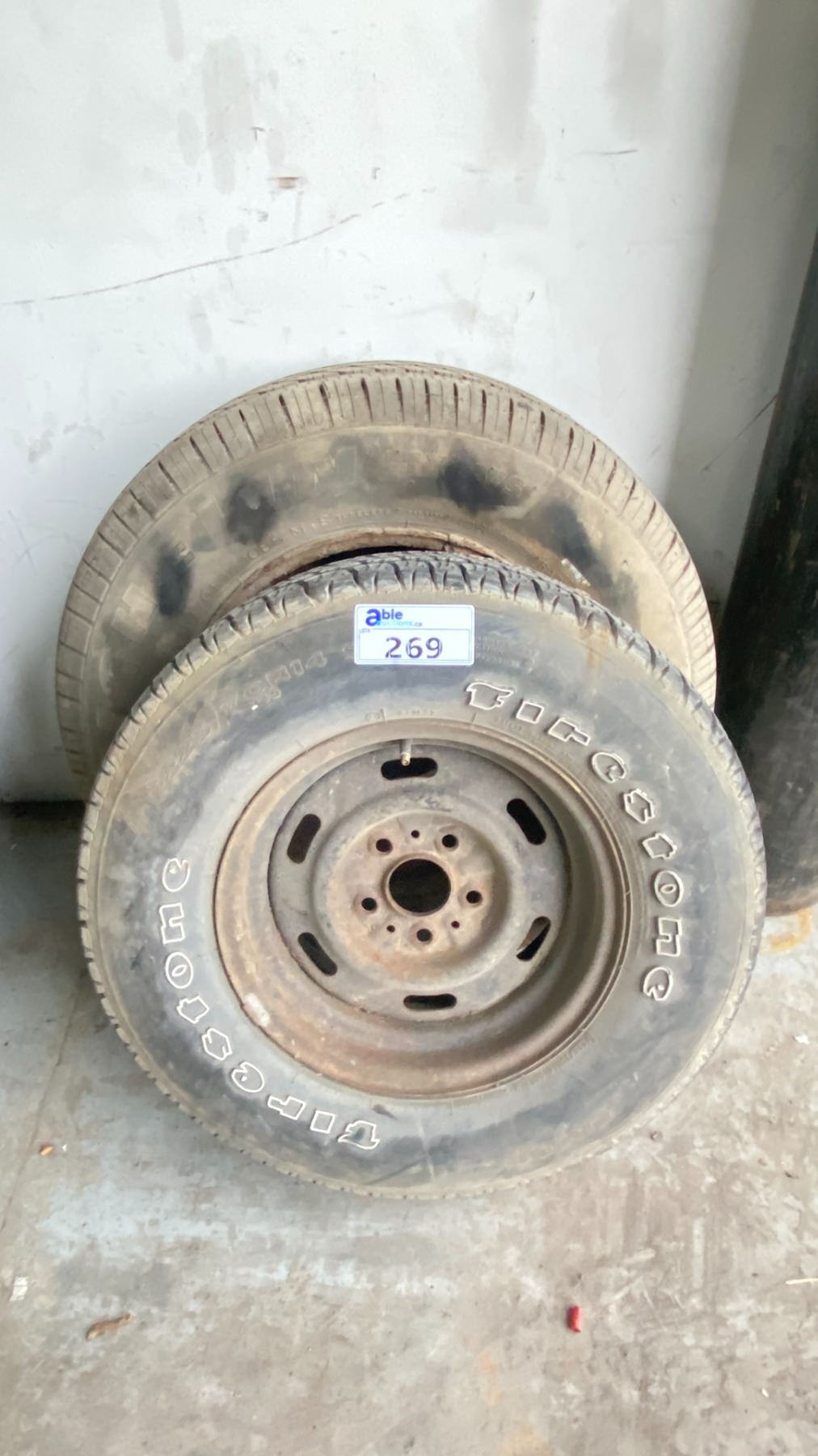 A FIRESTONE P225/70R14 WHEEL AND TIRE WITH A MICHELIN P245/70R17 WHEEL AND TIRE