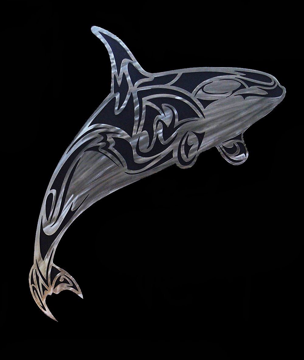 Orca Whale, 32 in wide x 48 in tall, Metal Artwork, Clear and Black Powder Coated Finish. Comes with welded hanging brackets for mounting. A one of a kind creation of Vancouver Island artist, Jerrod Pinder. Donated by: Ruggid Coast