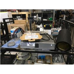 SHELF LOT OF ASSORTED AUDIO PARTS, SPEAKERS, AMPLIFIER