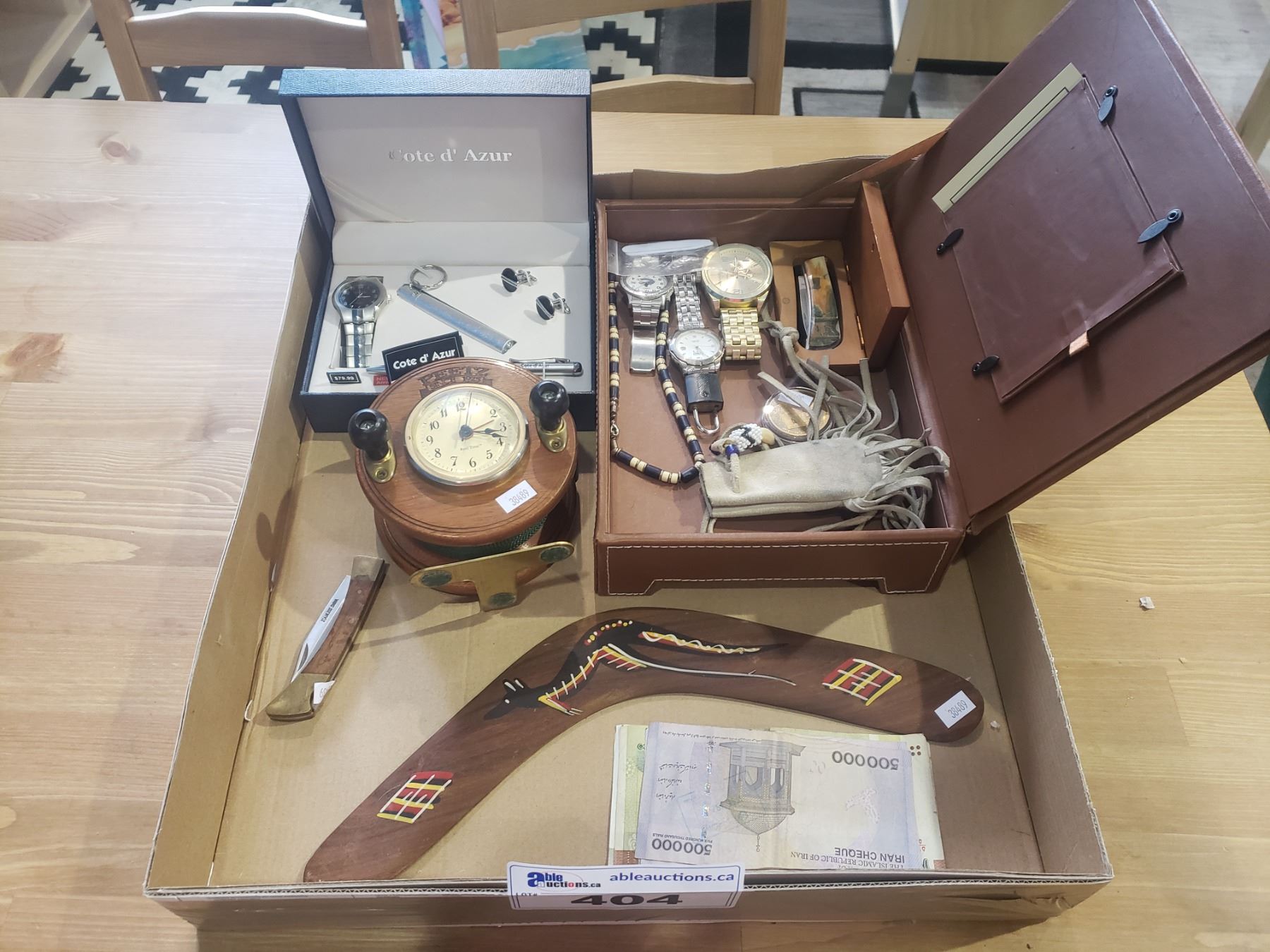ABORIGINAL AUSTRALIAN MADE BOOMERANG, STORAGE BOX WITH WATCHES, PEETZ FISHING REEL CLOCK, POCKET KNIFE AND MORE