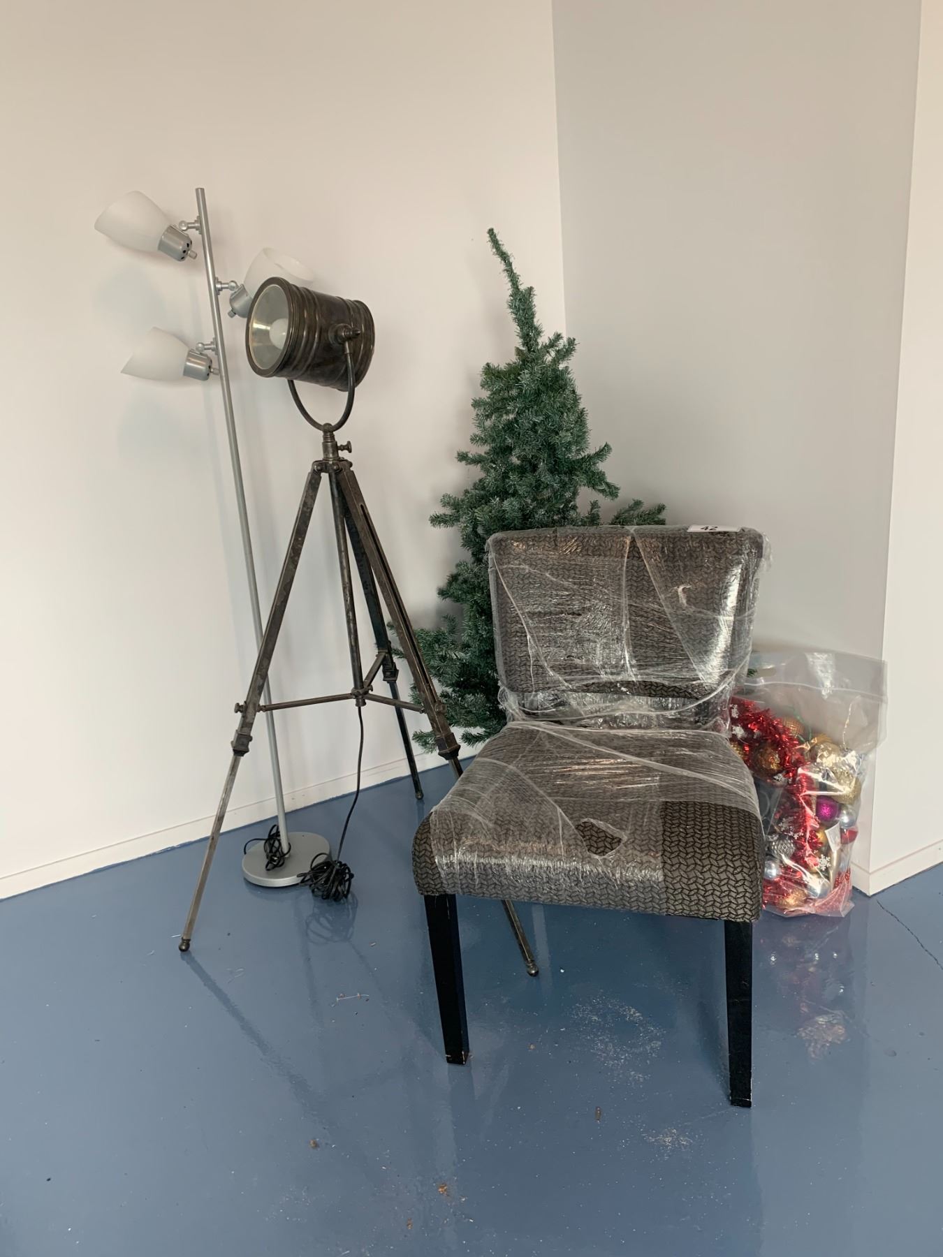 ACCENT CHAIR, 2 FLOOR LAMPS AND SMALL ARTIFICIAL X-MAS TREE W/ORNAMENTS