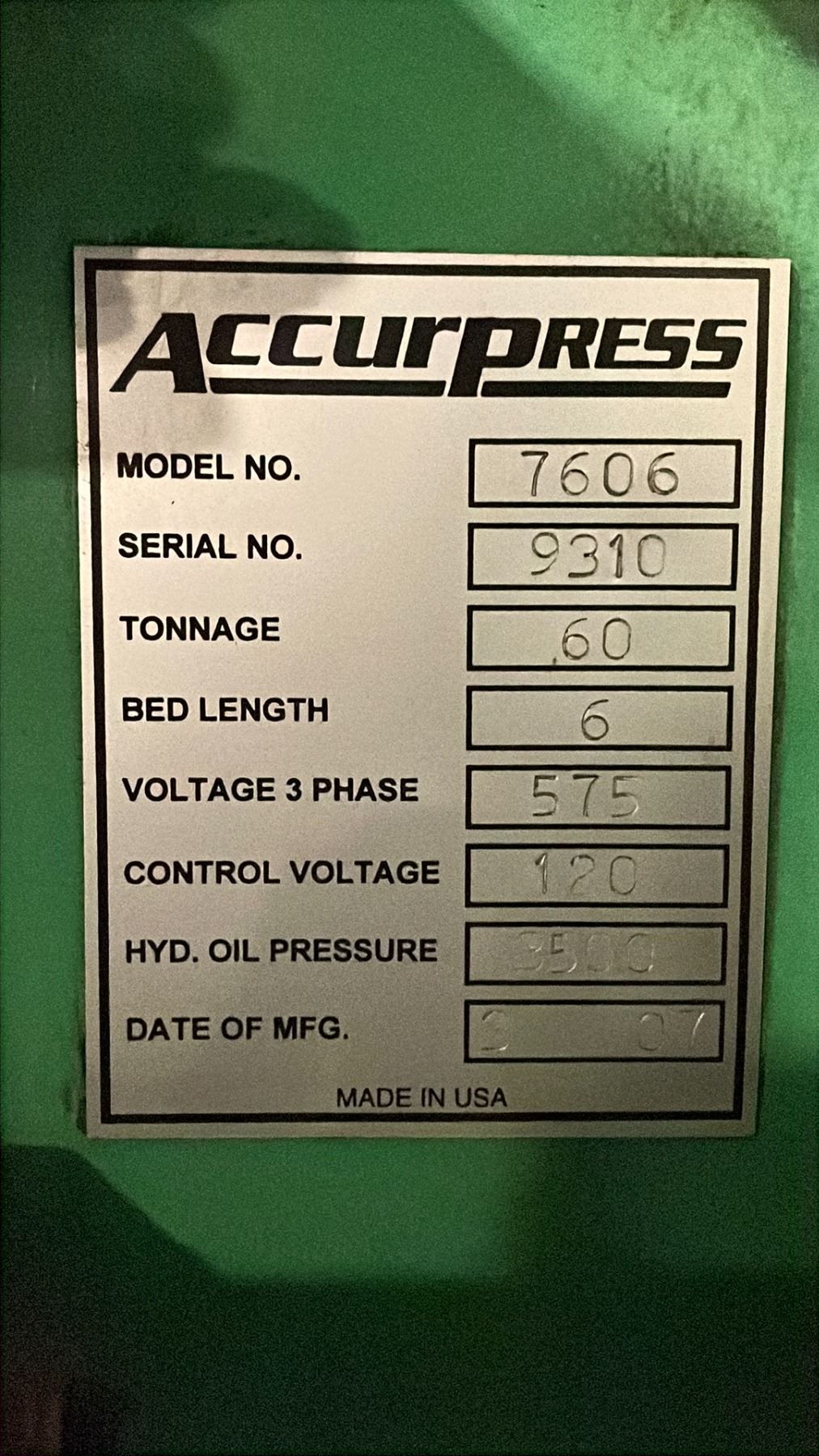 ACCURPRESS MODEL 7606 INDUSTRIAL STEEL BRAKE - 60 TON CAPACITY, BED LENGTH 6FT *WITH ETS CONTROLLER* **REMOVAL OF THIS MACHINE REQUIRES HIAB/CRANE LIFT** *FRI SEP 5 OR SAT SEP 6 REMOVAL