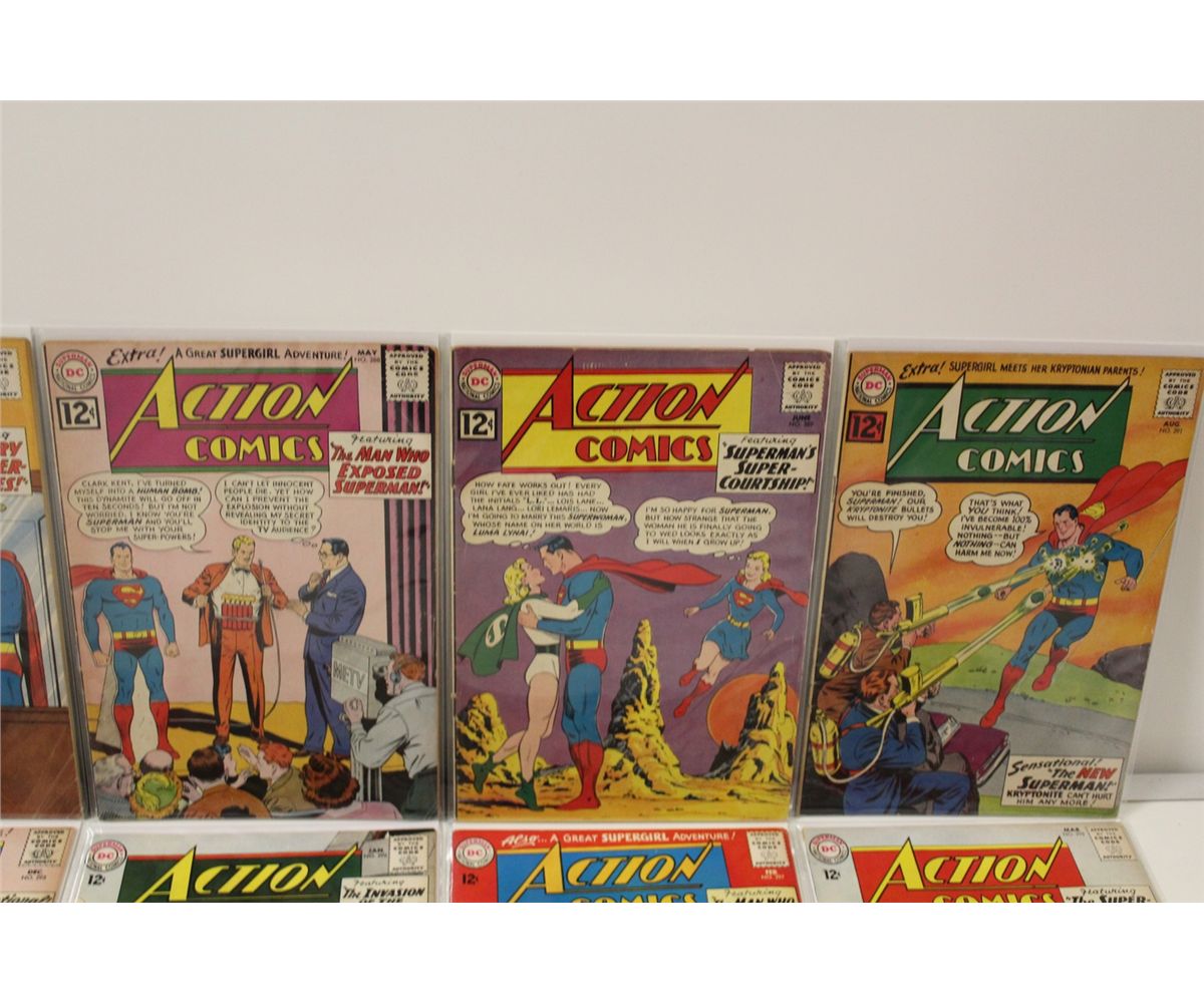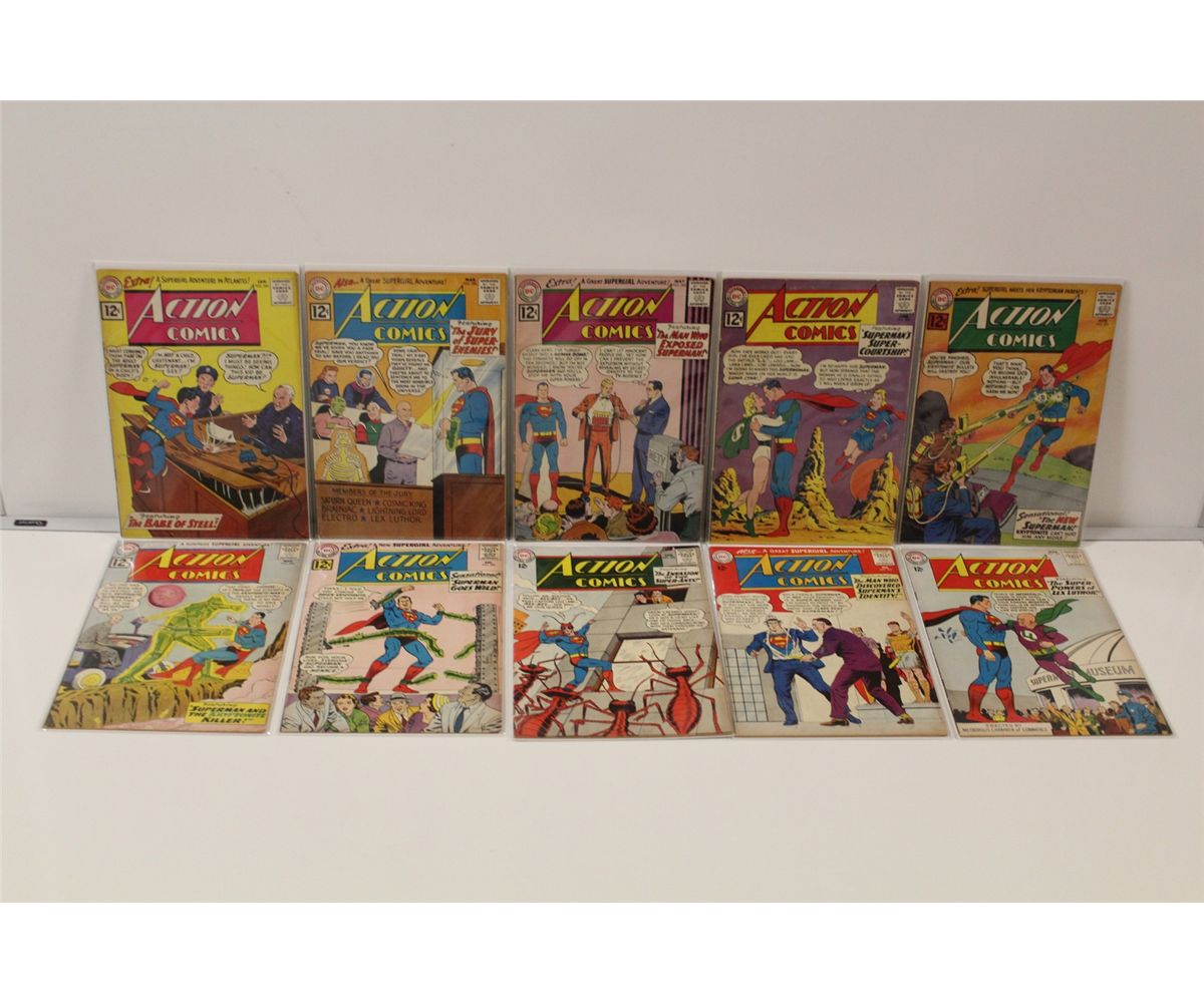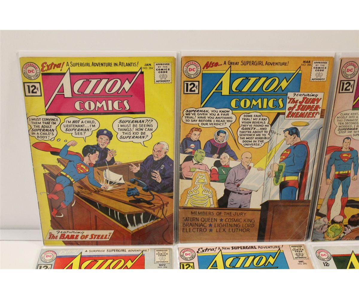 ACTION COMICS #284-298 (1962-63) NEAR COMPLETE RUN OF 10 DIFFERENT EARLY SILVER AGE ISSUES. INCLUDES #284, 286, 288-289, 291 & 294-298. SHARP MID GRADE AVERAGE, GLOSSY, TIGHT & SUPPLE, VERY NICE RUN!